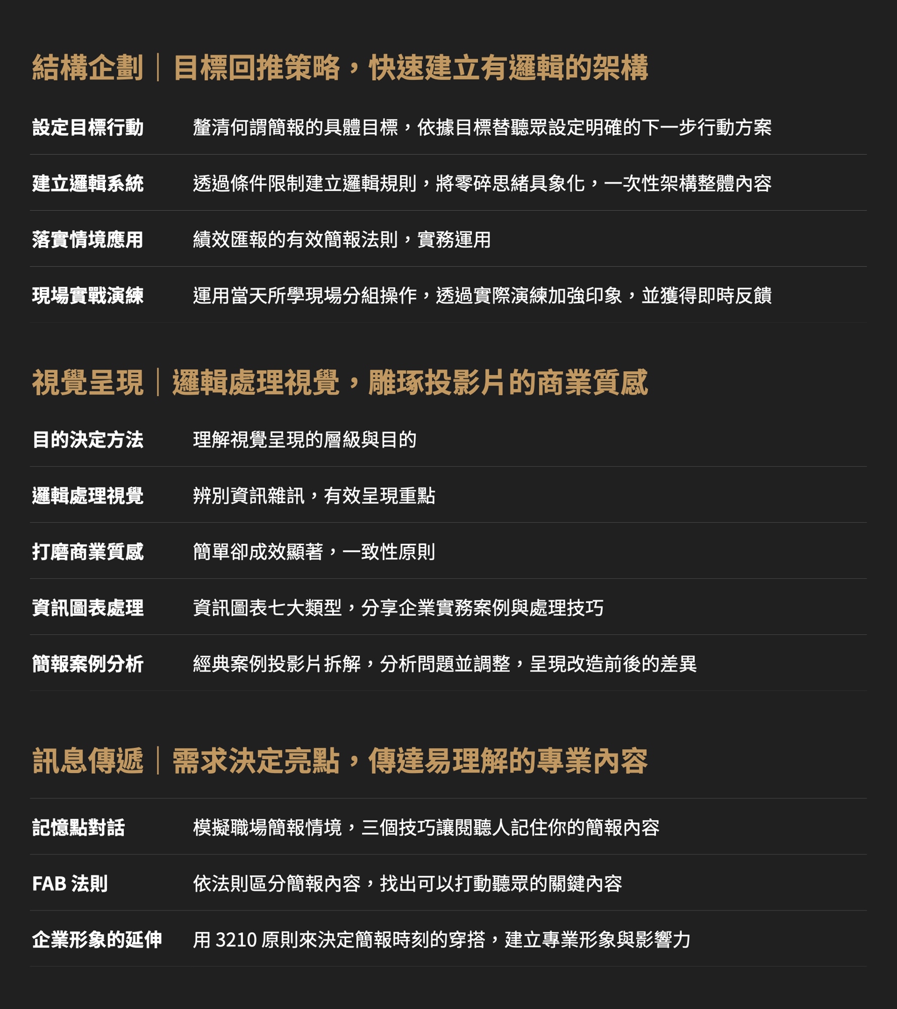 「商務簡報.有效職場溝通對策」以職場人士真實的場景為核心,專注在邏輯結構及有效的視覺呈現,並提供在工作中立即可落地實踐的方法。