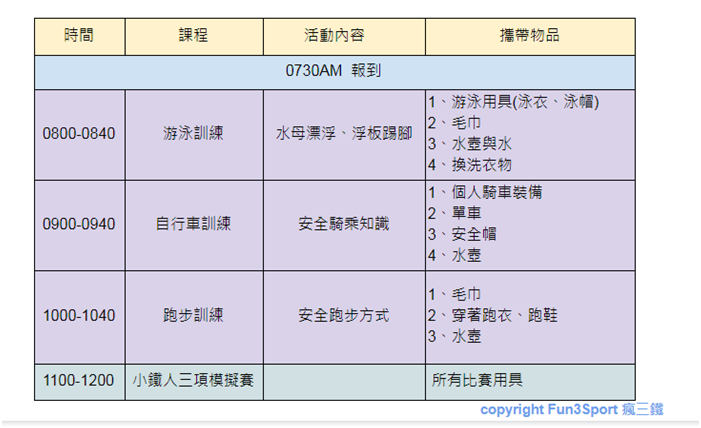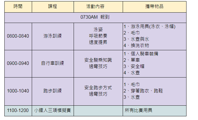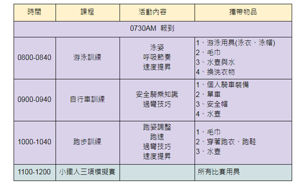 • 需自備物品:腳踏車/pushbike、安全帽、跑鞋、泳衣、泳帽、泳鏡、毛巾、換洗衣物