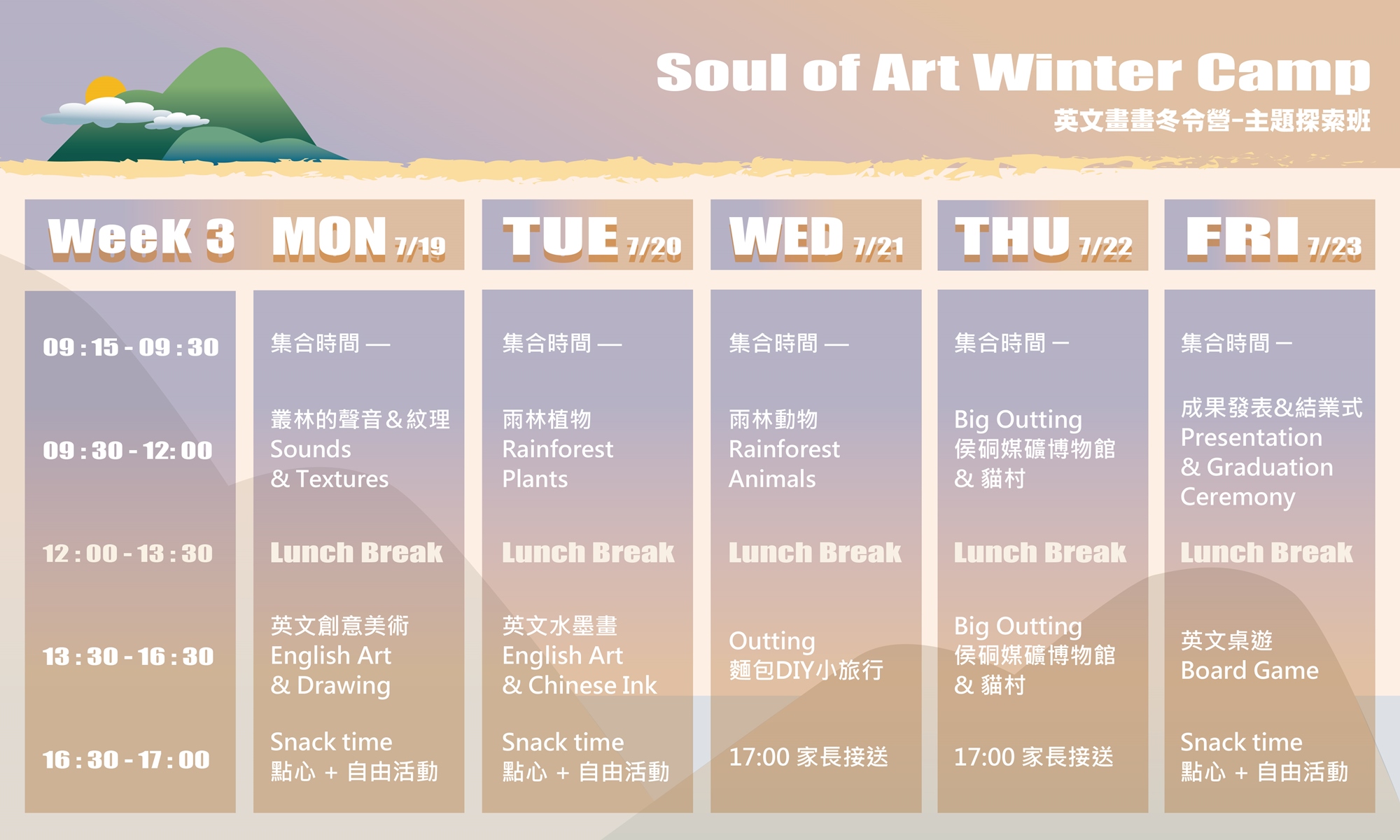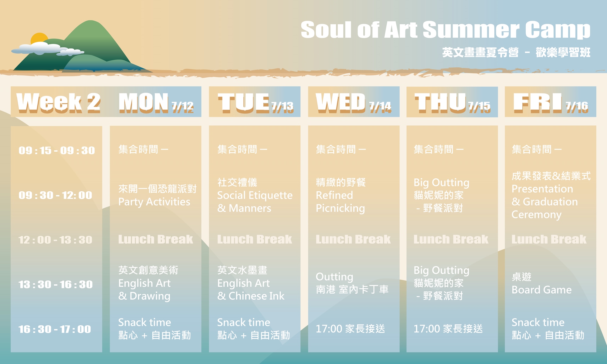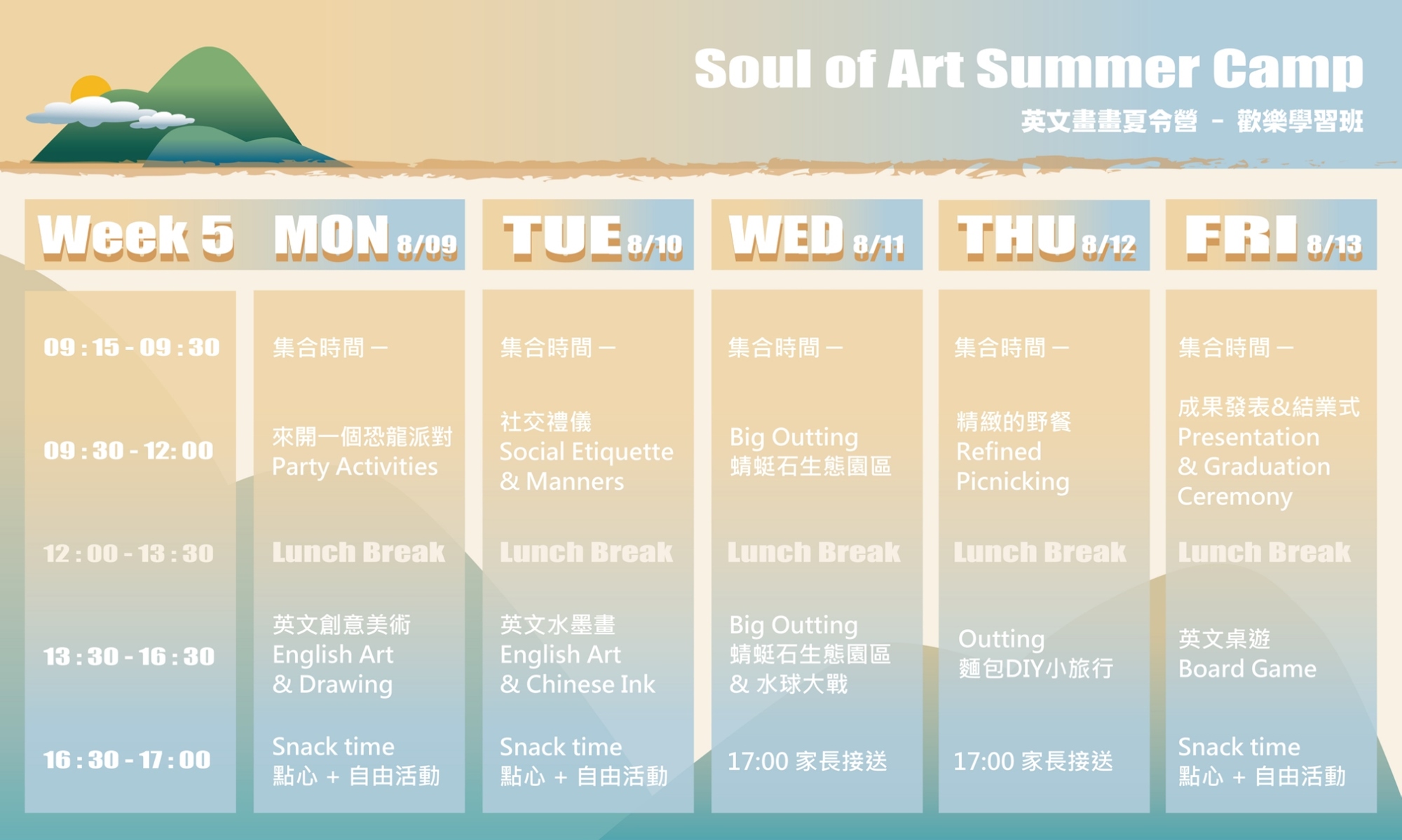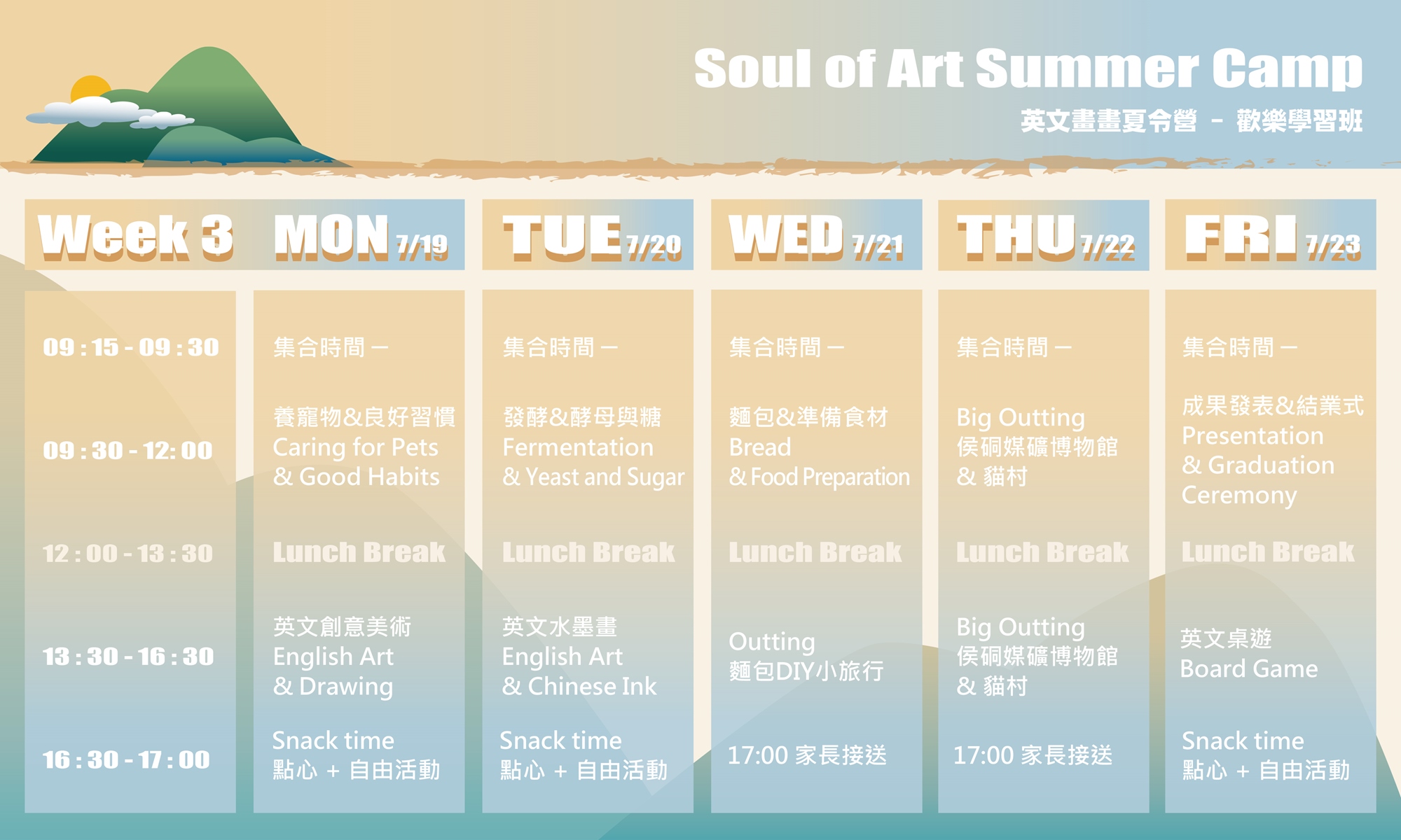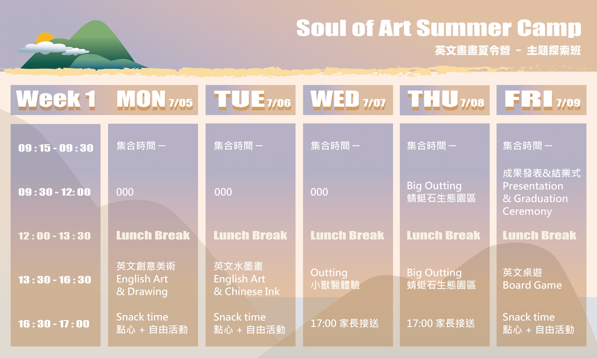 今年2021亞典美術英文畫畫夏令營從東區移到天母,增加了許多有趣的主題,英文水墨畫,英文創意美術,英文派對小主人,英文社交禮儀,麵包DIY小旅行,小獸醫體驗。戶外教學則是安排最受歡迎的室內卡丁車,宜蘭蜻蜓石生態農場一日體驗餵雞、撿雞蛋、種菜、摘水果+水球大戰,再往東北角走,學員們可以到金漫獎繪本得主-貓妮妮金瓜石的石頭屋一起野餐,如果到了侯硐煤礦博物館+貓村能體會台灣近代開發史,還可以順便感受懷舊的鐵道味。