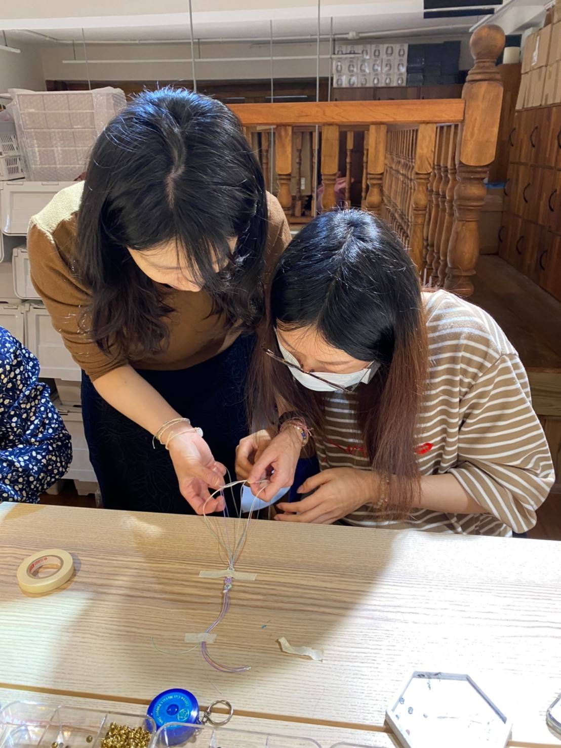 在老師介紹完水晶礦石的種類後,將由學生進行各式材料的挑選及素材的搭配。爾後,開始進行基礎編繩的介紹及教學,先從最基礎的手繩開始示範。接著,開始進行花花編織課程的編織,老師將從旁進行解說。(基礎編繩教學包含蛇結、金剛結、平結、秘魯結、花式編繩等,課程時間預計為2小時,仍需以個人編織速度為主)。