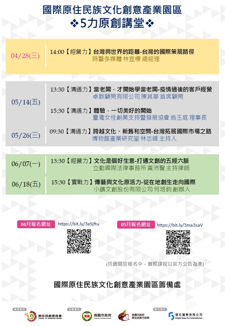 桃園市原住民行政局執行原住民佈建通路計畫,特別為桃園市原住民及相關文創業者規劃系列課程,邀請文創業界講師進行案例分享、品牌行銷、通路經營等課程,藉此培訓課程提昇原住民文創實力,優化原住民文創商品,進而能增加市場競爭力,讓原住民文化藝術走入大眾生活。