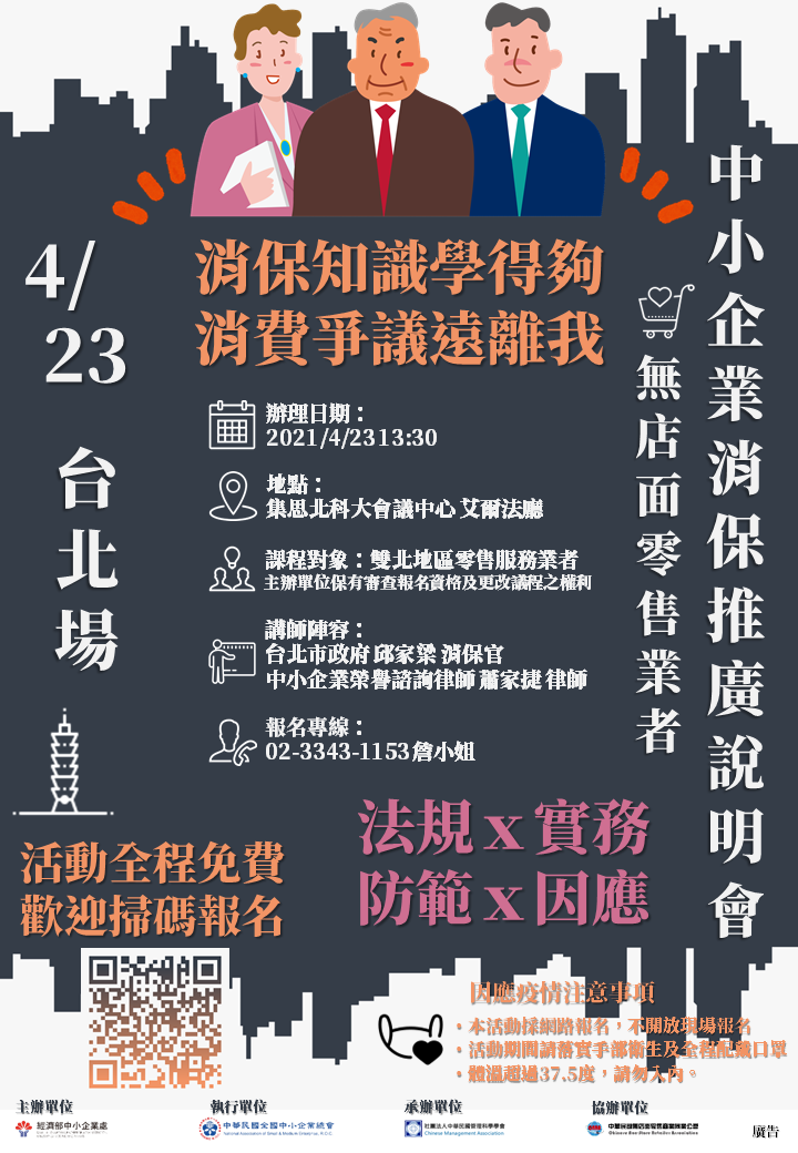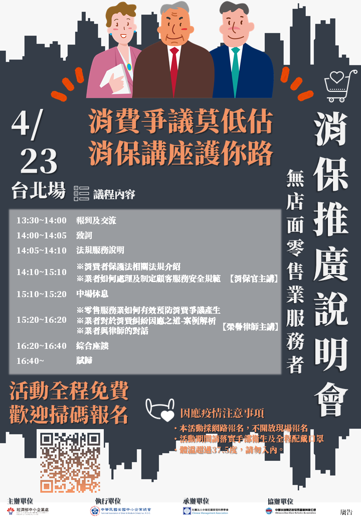 本次台北場為針對 #無店面零售服務業者、中小企業經營者必須知道的消保爭議防範秘訣