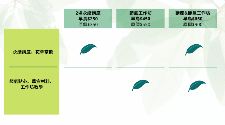 。此頁面可報名節氣工作坊及講座合報,單獨報名講座請於此頁面報名。