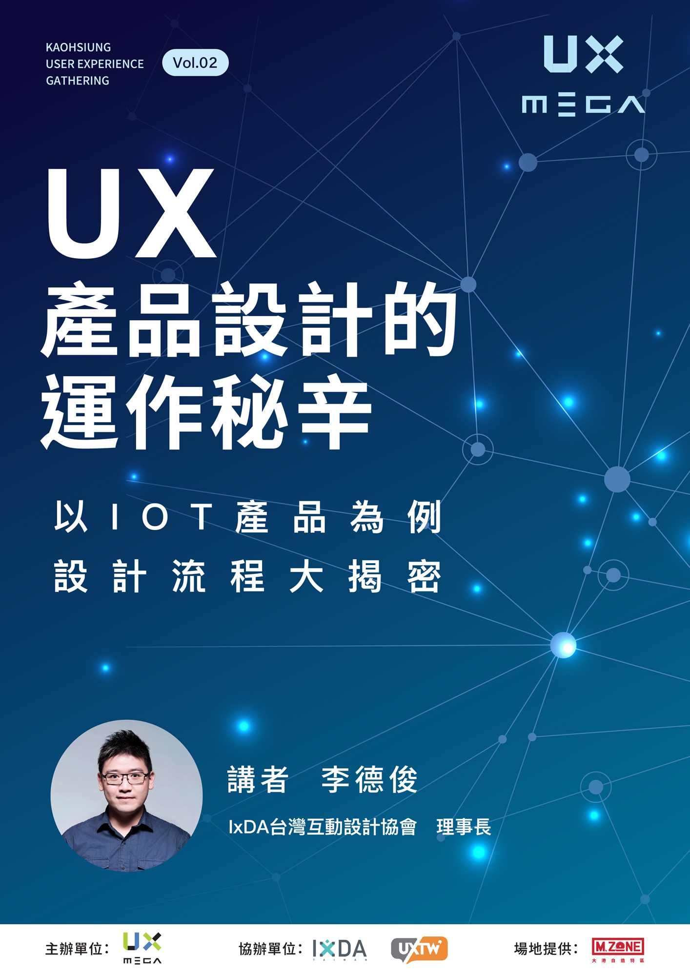 資深設計師李德俊將以UX設計師的角度,分享IoT產品的設計流程、如何透過UX設計思考打造出美好的使⽤者經驗,並應用在軟硬體設計上。你也能深度了解一個專案從零到有的運作過程。讓我們用兩小時,進入IoT產品設計的大門,一窺背後的祕密世界!