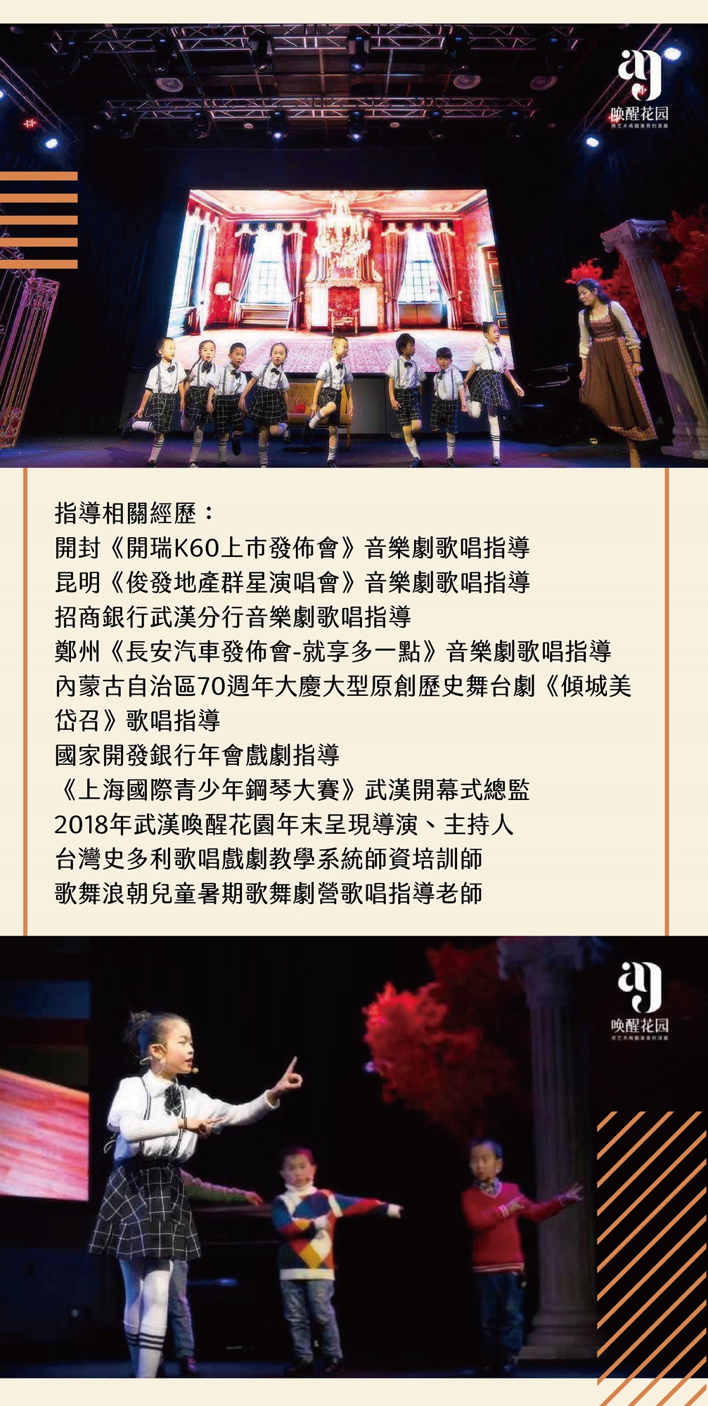 歌唱再結合戲劇課程,不只讓孩子能在多元音樂藝術中快樂的學習成長,更豐富孩子的生活經歷,給孩子一個鍛鍊自我的舞台,對於孩子來說是一種在課本上學不到的知識。每一次的演出對於孩子來說都是一種鍛鍊,每一次的登台都是一次藝術的實踐過程,這種通過自身感悟的能力是終身受益的。