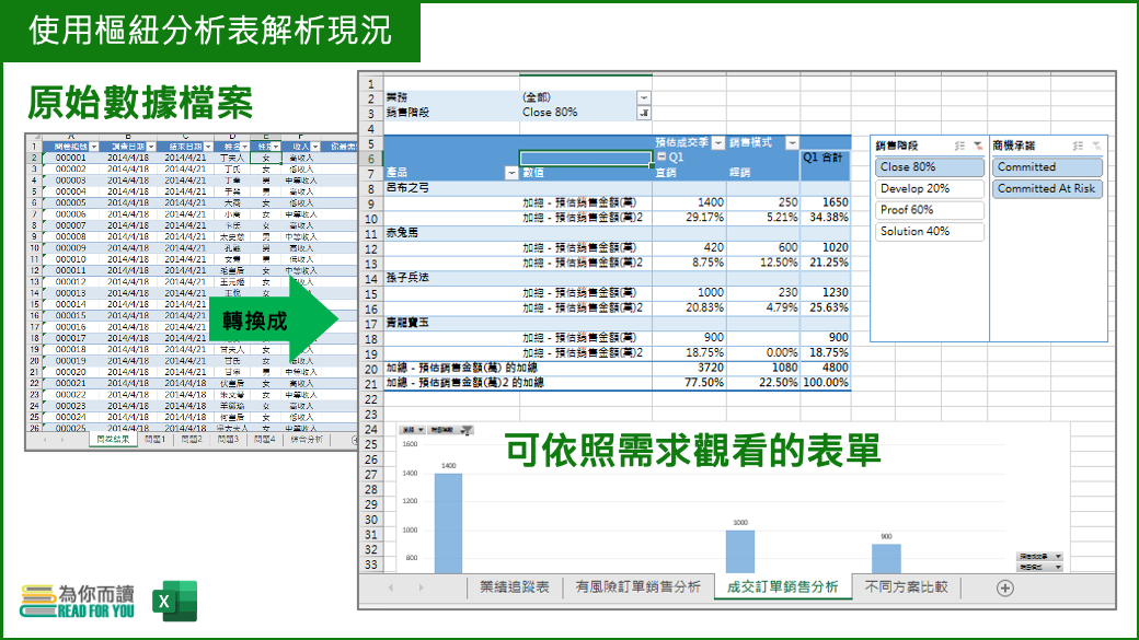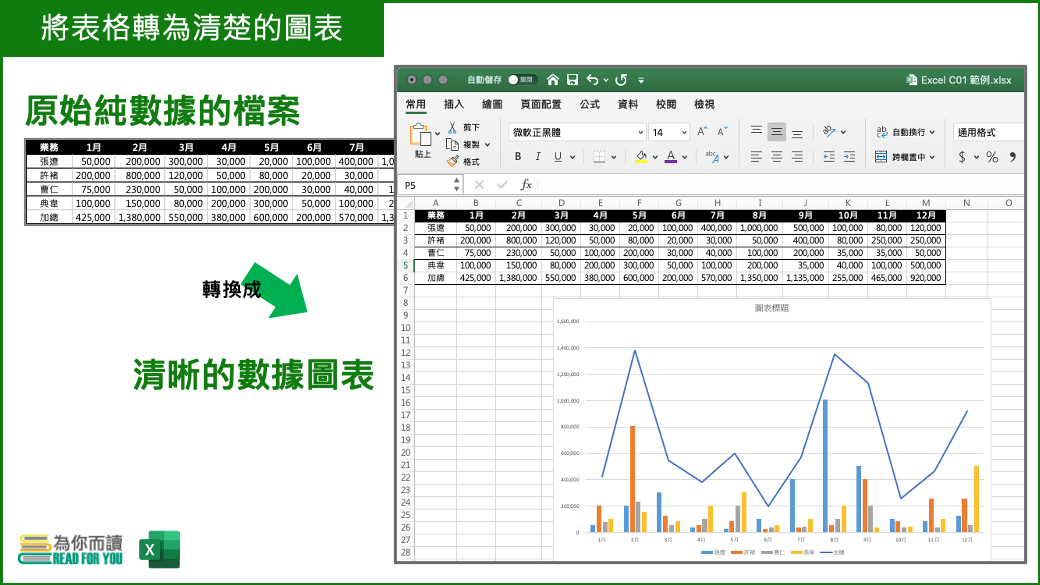 1. 視覺圖表:透過Excel工具將數據表格快速轉化成清楚好懂的視覺化圖表。 |