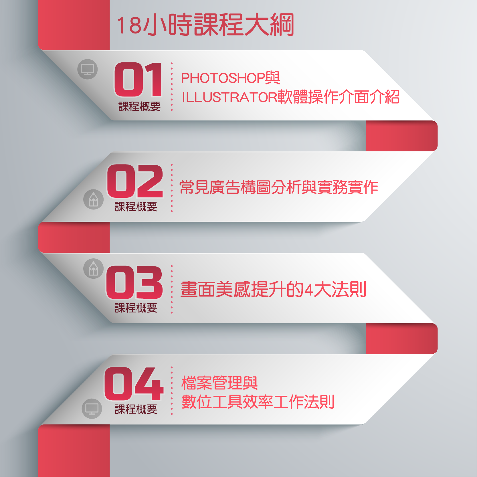 - 課程針對無設計基礎社群媒體小編與電商經營者、想學習第二專長,最完整學習的實作班,兩套軟體(Photoshop & Illustrator)的使用邏輯入門,到提升美感的觀念分享以及視覺設計技巧分享等層面作詳盡教學。