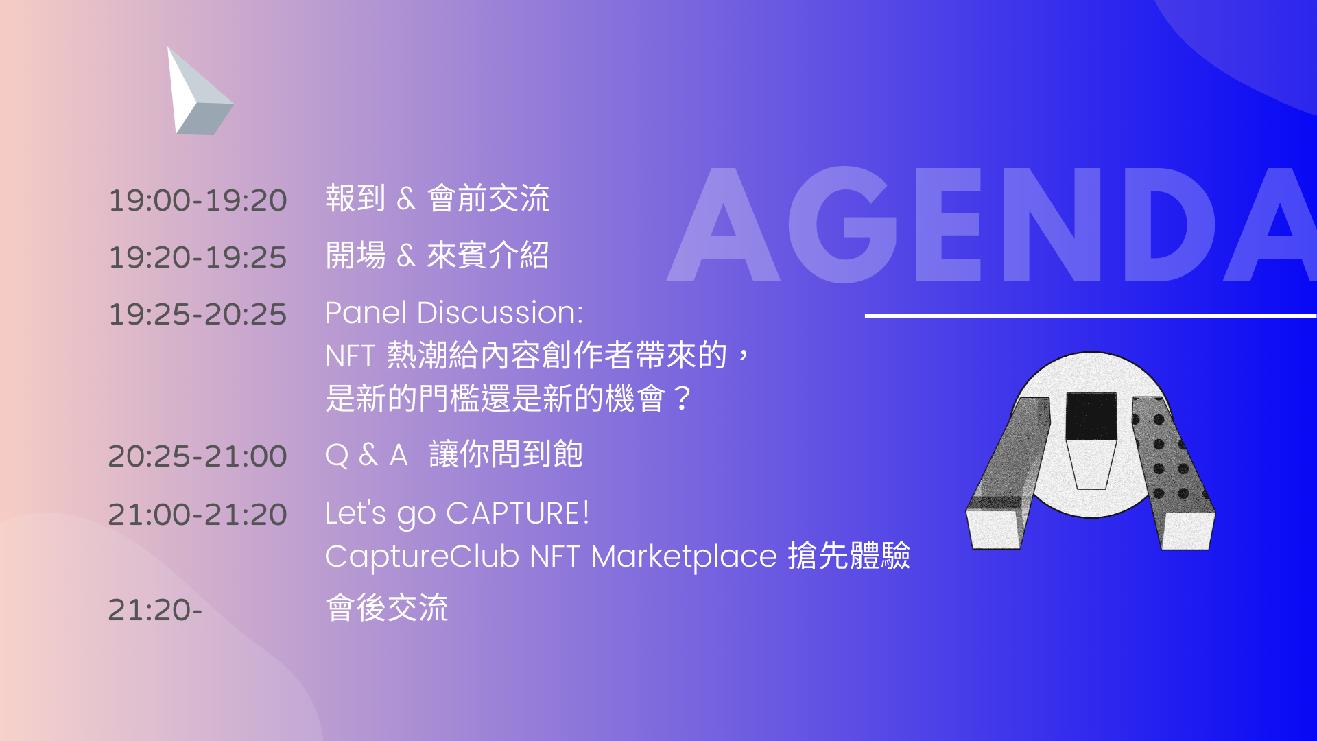 - 活動當日體驗結束後現場加入「CaptureClub 創作者支持計畫」者,可獲免費 NFT 發行諮詢乙次,五月底前策展檔期優先卡位免訂金!