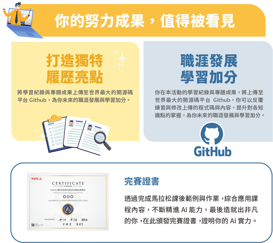 - 你在本活動的學習紀錄與專題成果,將上傳至世界最大的開源碼平台 Github,你可以反覆練習與修改上傳的程式碼,提升對各知識點的掌握,而這些紀錄將為你未來的職涯發展與學習加分。