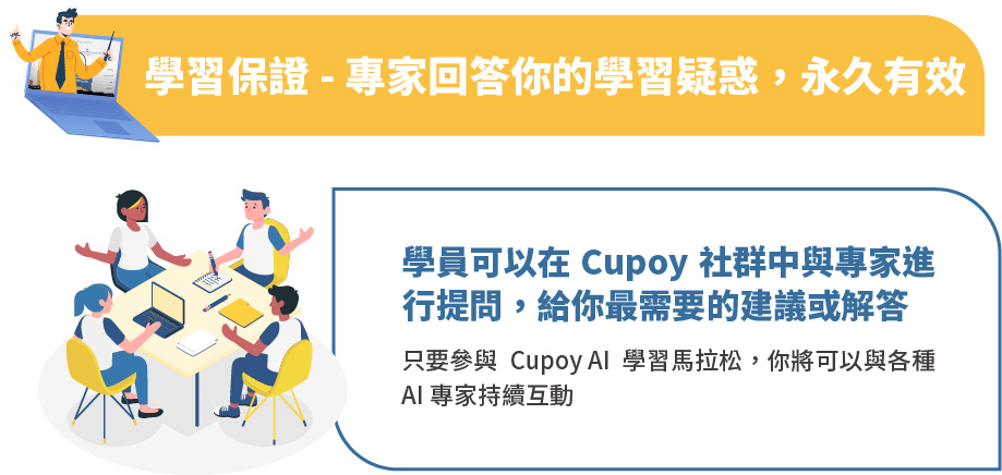 本活動的學員能永久使用 Cupoy 的 VIP 共學社群服務,隨時與專家群切磋討論 AI 問題,自由交流與觀摩其他學員作品與模型。