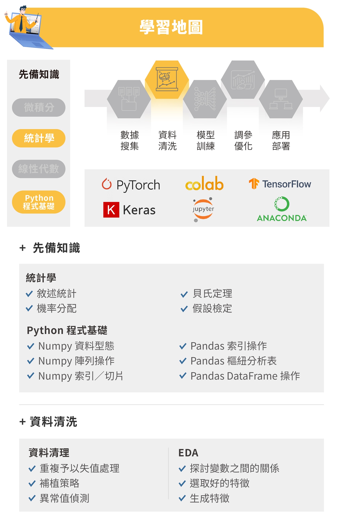 - 資料科學中常用的統計學:用敘述統計描述資料的樣態、用機率分布描述亂中有序的世界_離散分配與連續分配、用貝式定理讓決策更精準、掌握 AB test 的精隨。