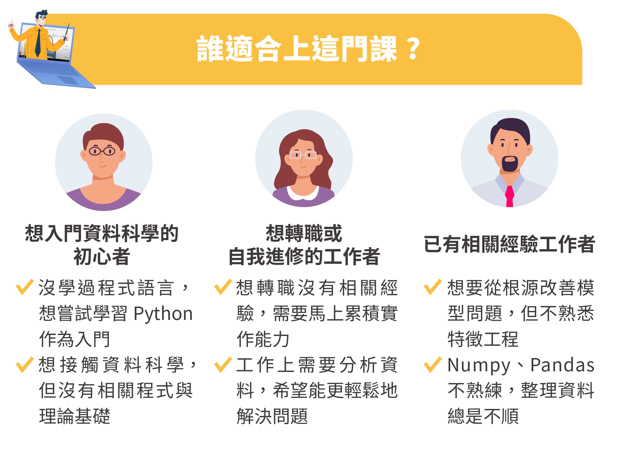 要成為一個稱職的資料科學家,必需涉獵程式開發、數學/統計、領域知識等三大領域,本課程特別邀集業界第一線的資料科學家,用 Python 作為工具,讓學員學會如何進行資料科學程式開發以及手把手完成一場資料科學專案,讓你用 60 天 挑戰成為資料科學家的必經學習歷程。