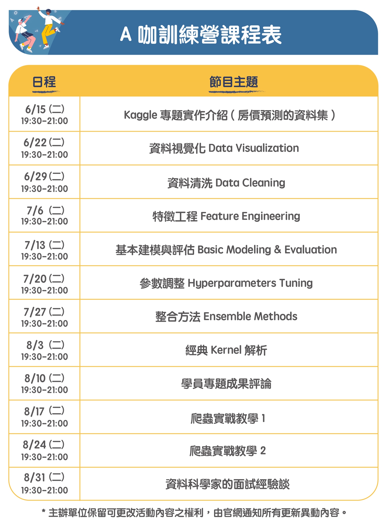 學習資料科學最重要的就是實作!本次訓練營挑選 Kaggle 上的經典案例:房價預測,資料集能夠完整的運用 SOP 中的每個階段。現在就讓專家手把手帶你從實戰中學習,掌握高分關鍵,未來挑戰更多專案。