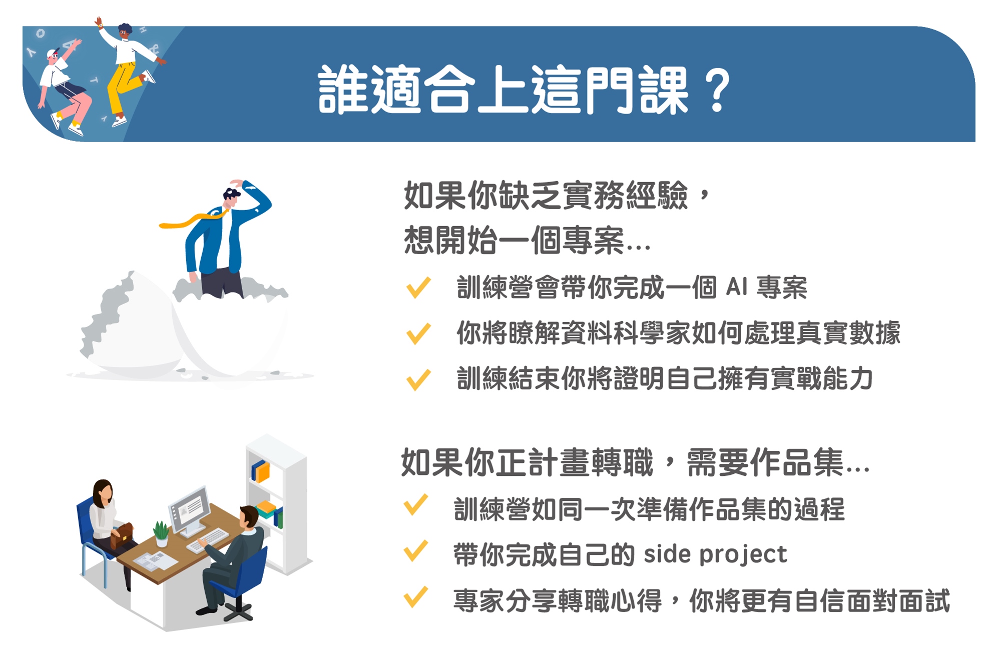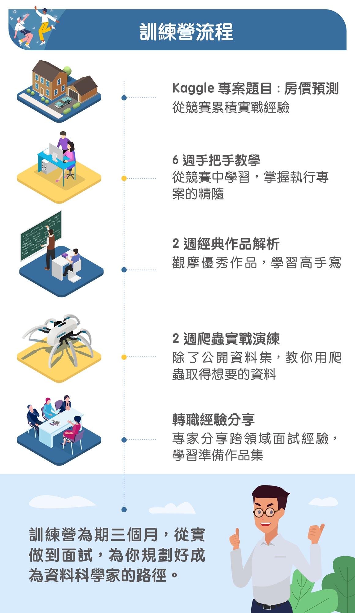 📌訓練營為期三個月,從實做到面試,為你規劃好成為資料科學家的路徑。