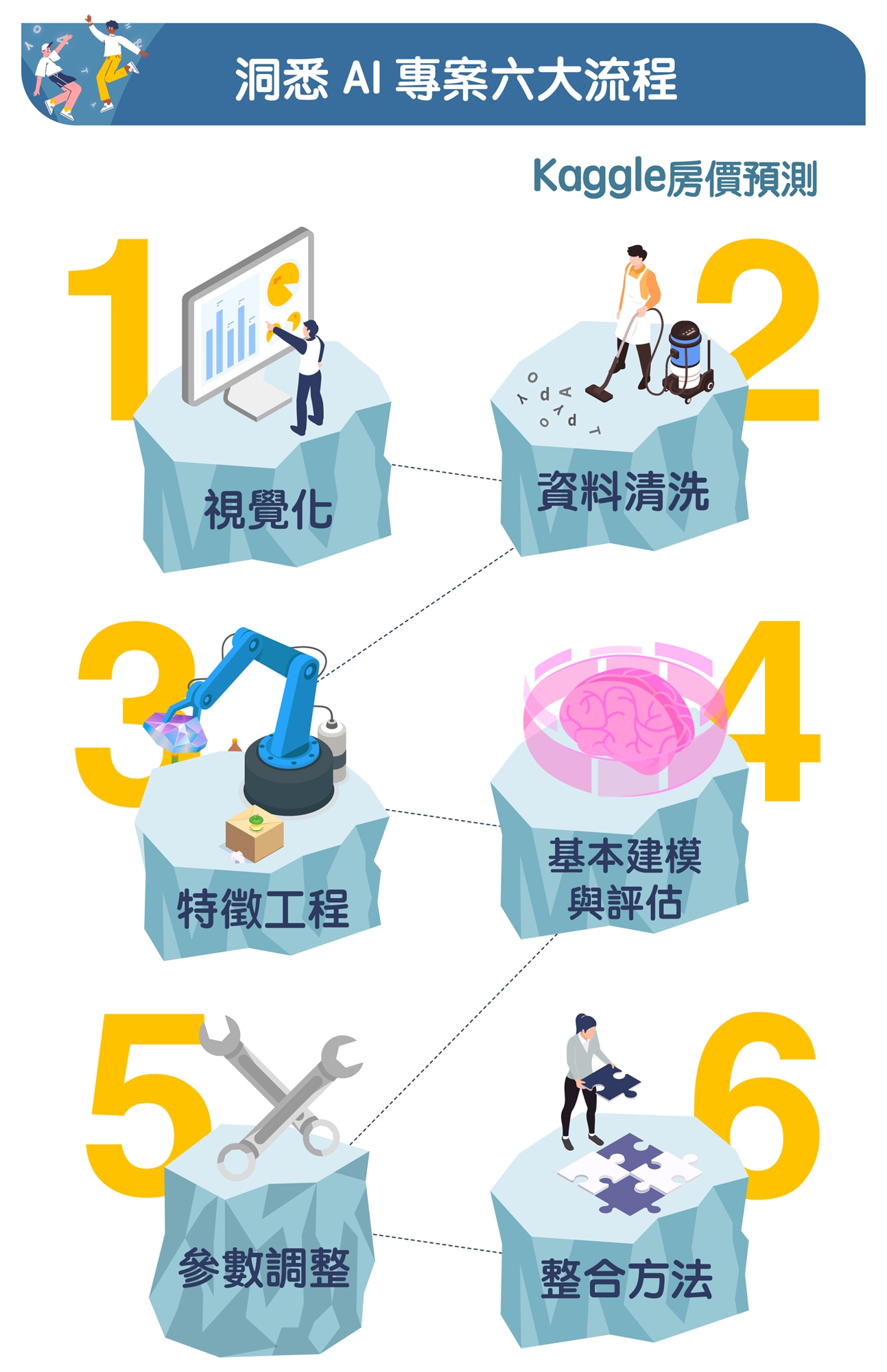 視覺化 → 資料清理 → 特徵工程 → 基本建模與評估 → 參數調整 → 整合方法