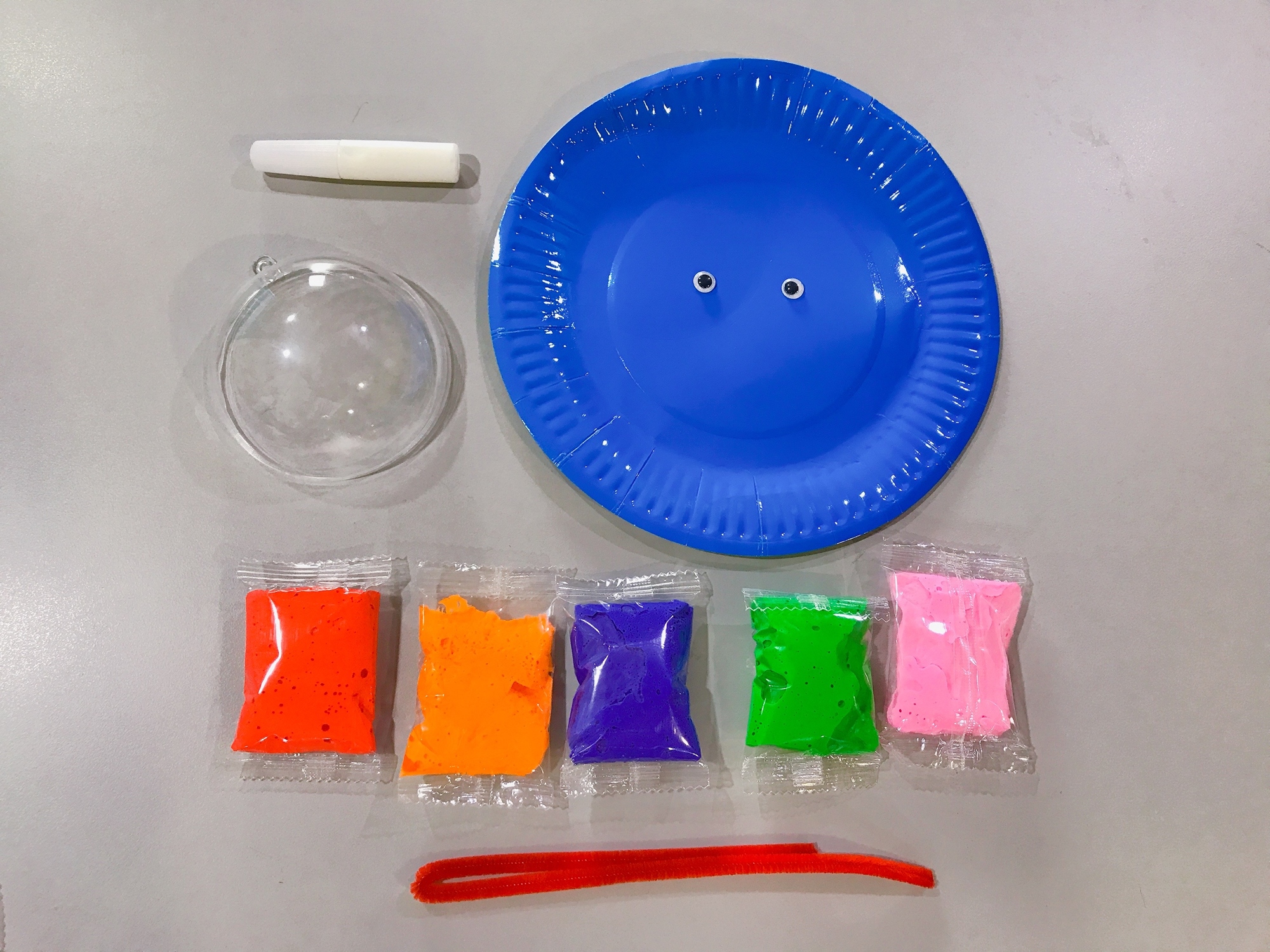 輕黏土4-5色、裝飾材料*2、紙盤*1、半圓透明罩*1、迴力車底座*1