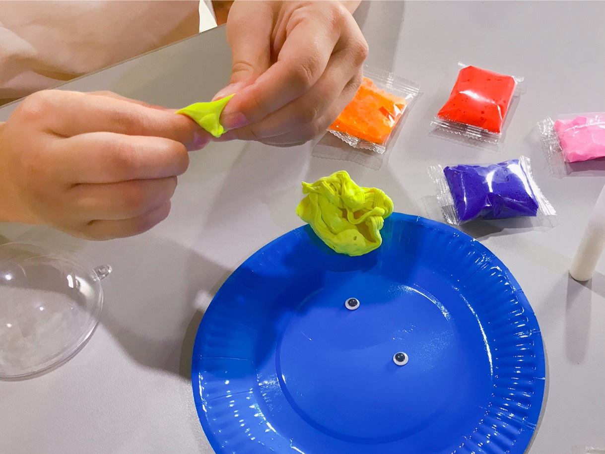 大耳朵、單眼皮外星人在小小的腦袋裡裝了奇幻異世界,此體驗運用孩子們天馬行空的黏土製作外星人、玩創意。