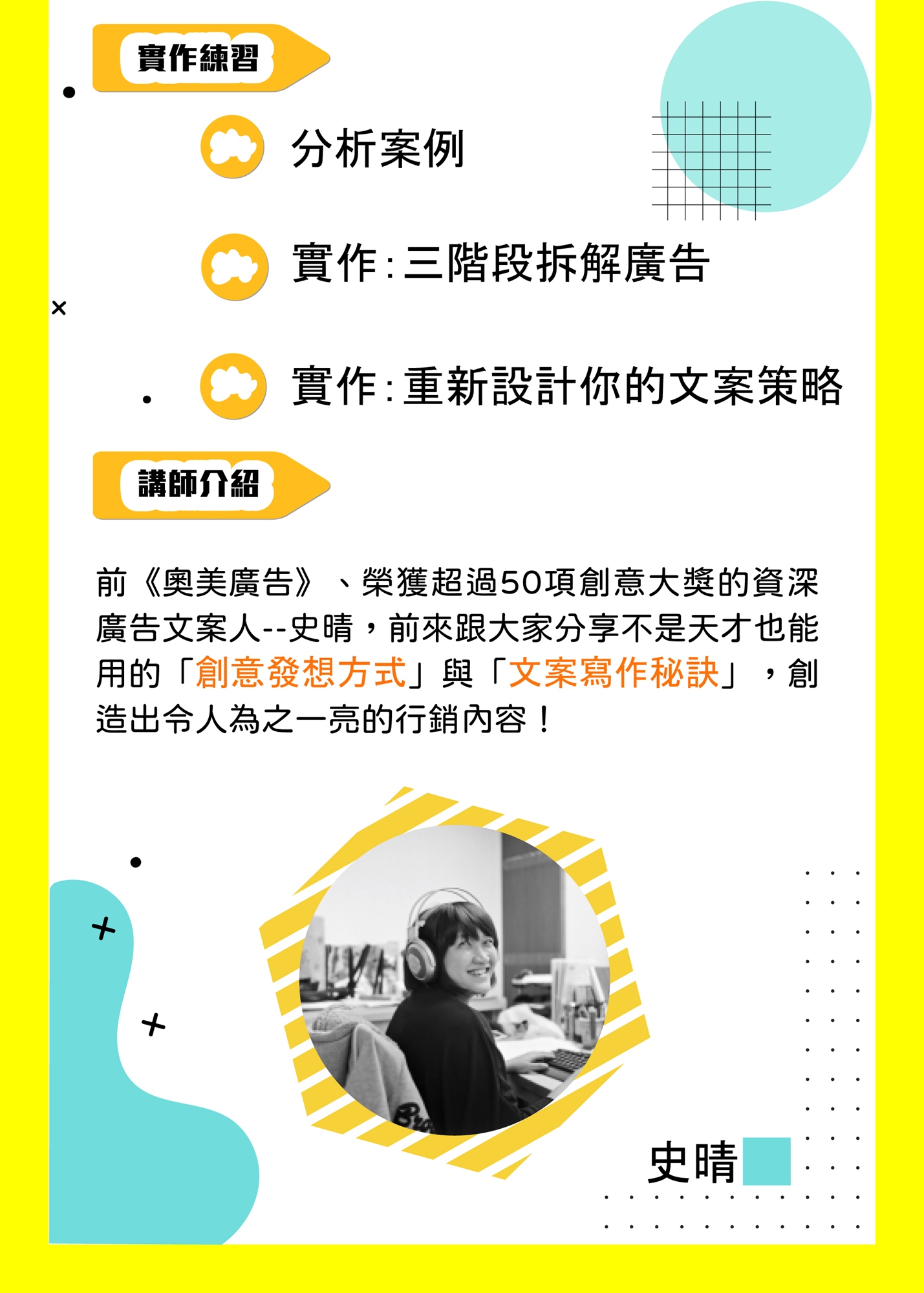 - 課程名稱:爆紅文案這樣寫!文案創意思考邏輯實戰班