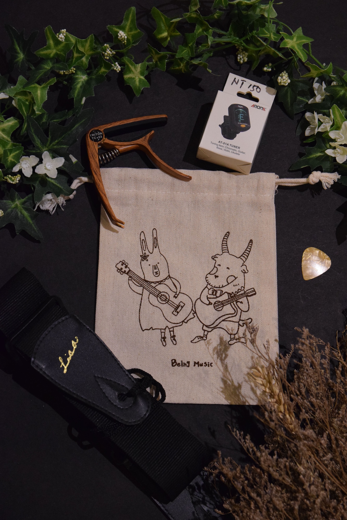 【存在音樂】吉他新手包-潮泥馬束口袋、調音器、CAPO夾、吉他背帶、PICK