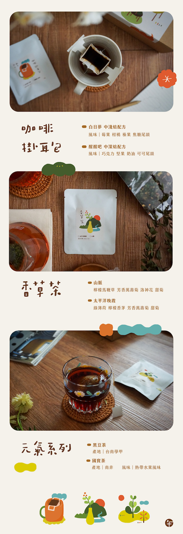**飲品隨身包 x6、x10:請於報名問卷選擇想要的飲品組合(咖啡掛耳包、台東香草茶、元氣茶)