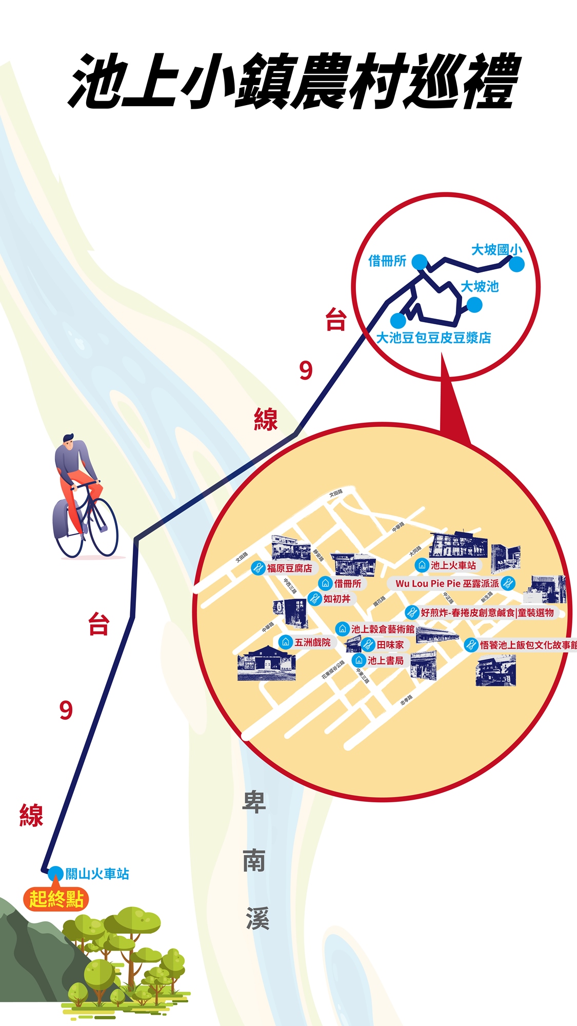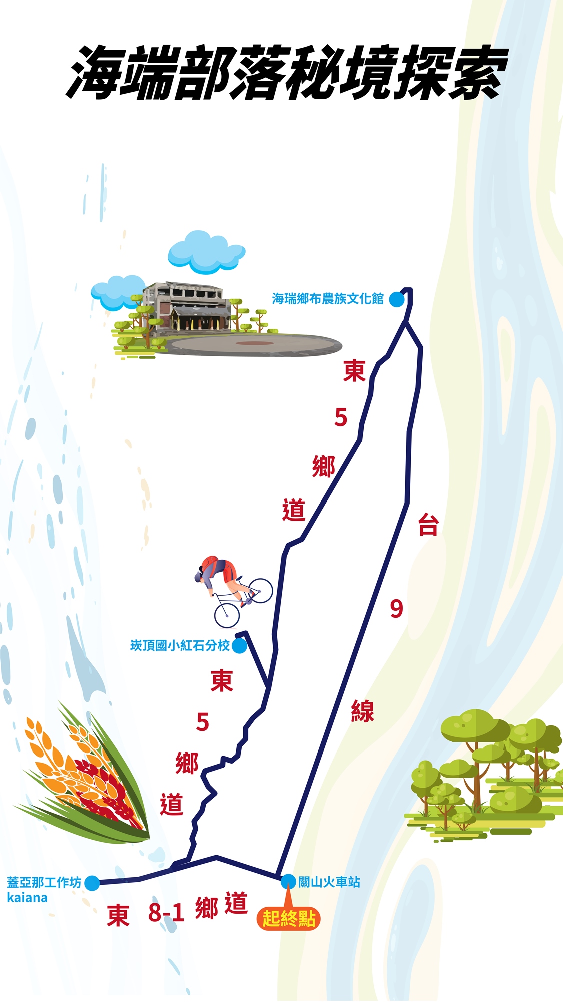 透過自行車漫遊瑞穗、玉里、海端到稻米之鄉關山、池上,帶領民眾按圖索驥,探索花東歷史悠久的文化遺跡、特殊地景以及原鄉部落,透過美食地圖與DIY手作體驗更深入了解花東之美,並結合時下最夯的網美打卡點以及集章活動,飽覽花東縱谷獨特風光,快揪一下愛騎車玩耍的好朋友手刀一起報名!