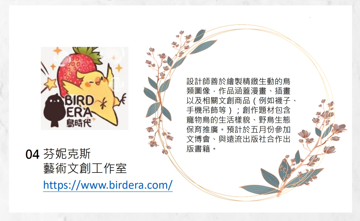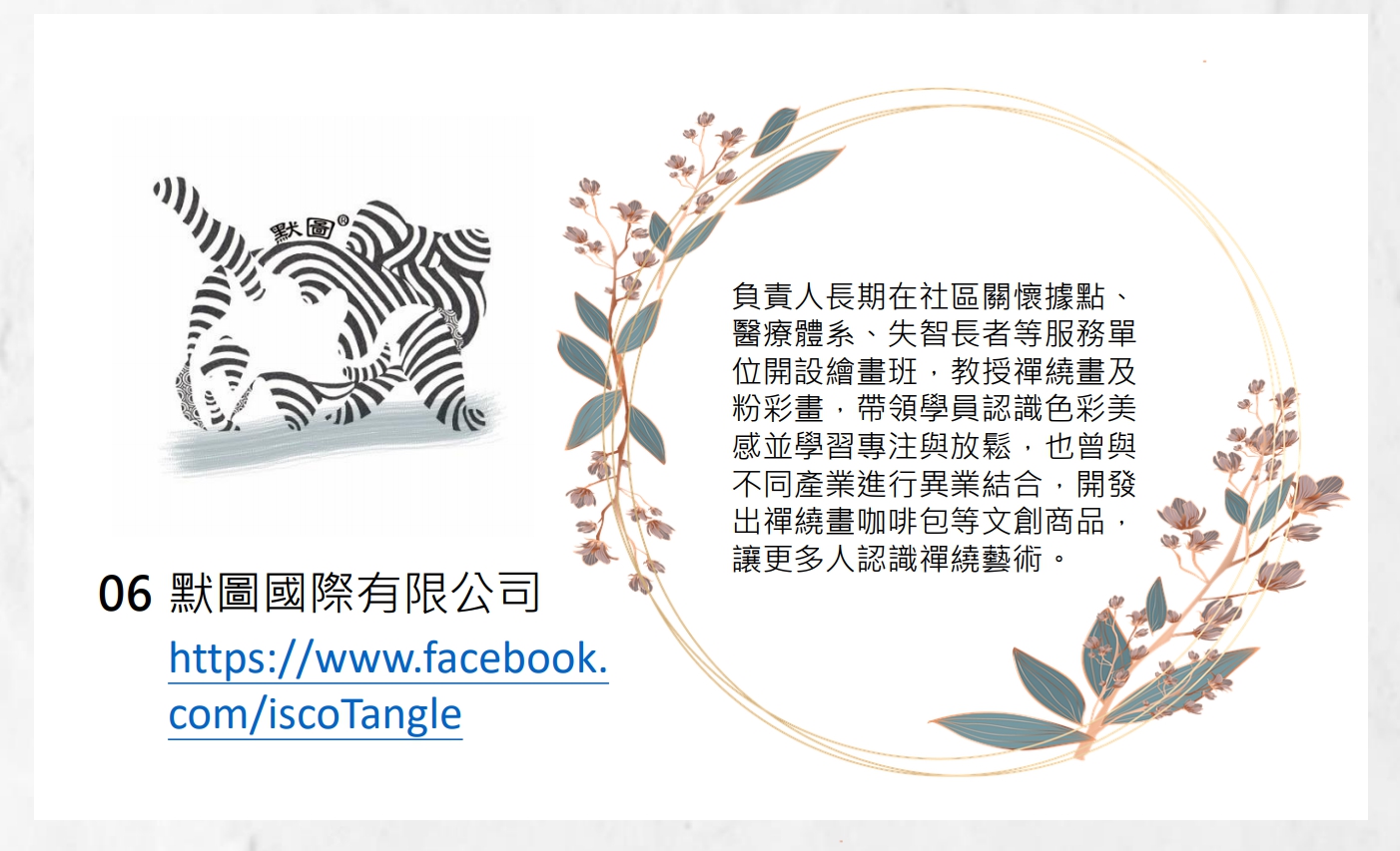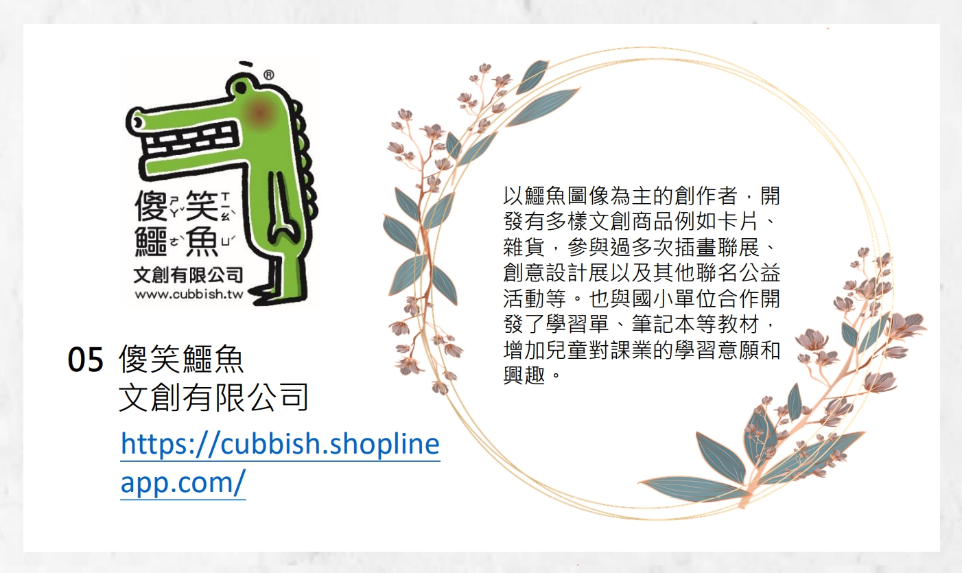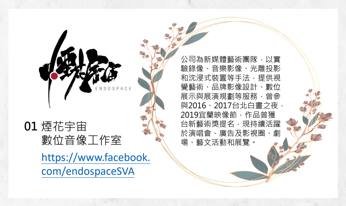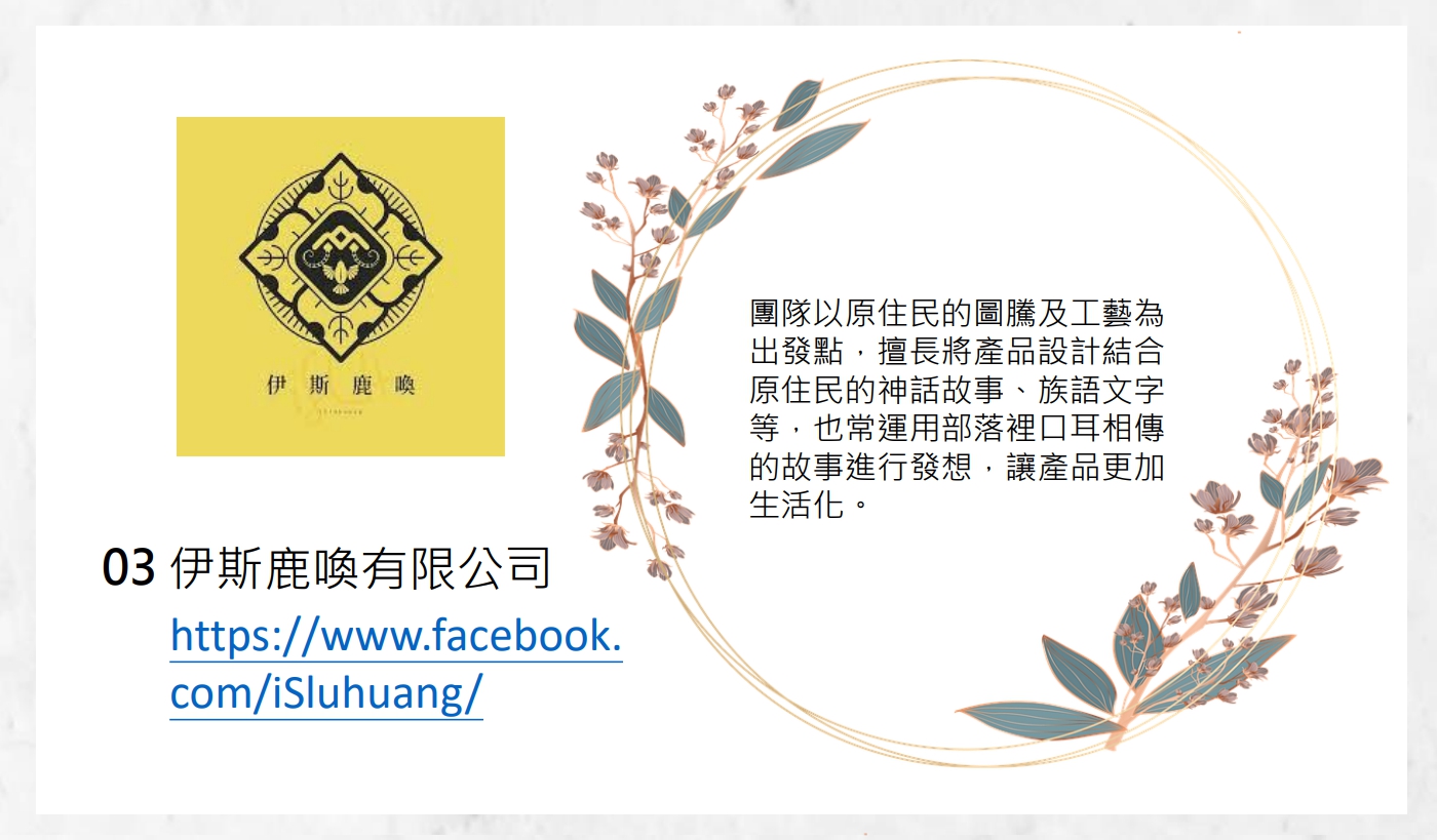 本次媒合會參展業者共10家,分別為煙花宇宙數位音像工作室、獨立製作、伊斯鹿喚有限公司、芬妮克斯藝術文創工作室、傻笑鱷魚文創有限公司、默圖國際有限公司、比亞的草屋琉璃珠工坊、李氏皮件企業社、赤赤子有限公司、利希亞股份有限公司。
