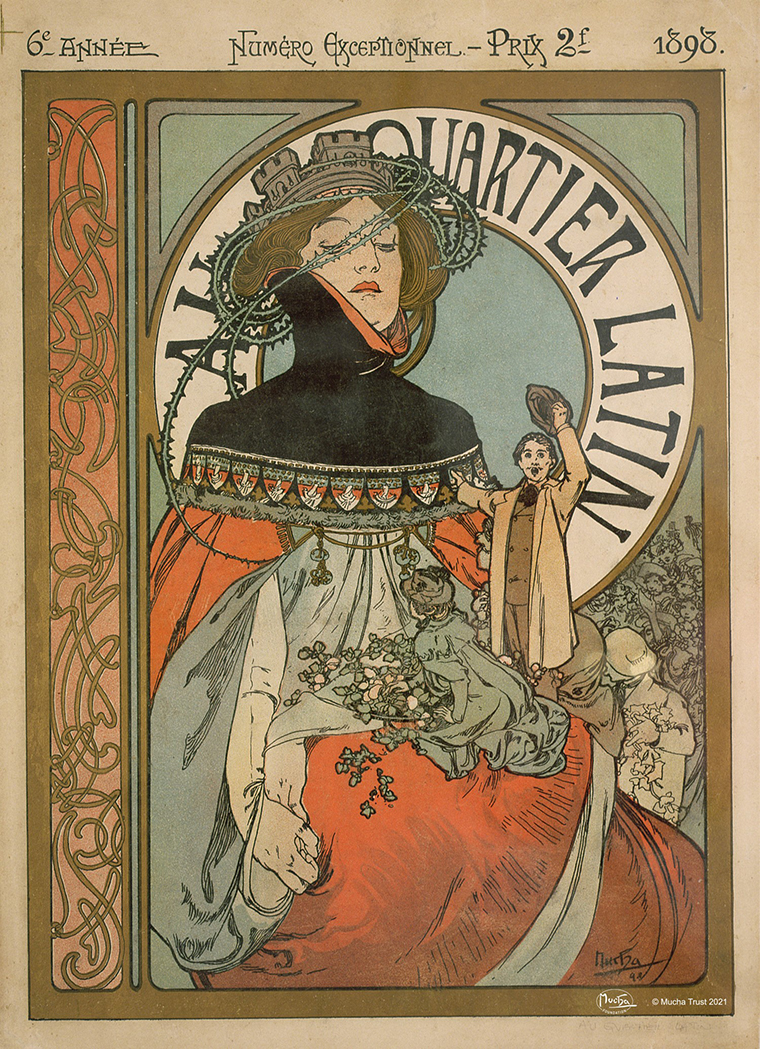 《拉丁區》雜誌封面(1898年雜誌六週年特別號)/ 1898年 / 插圖雜誌封面,由史特勞斯出版社於巴黎 發行,石版彩色印刷