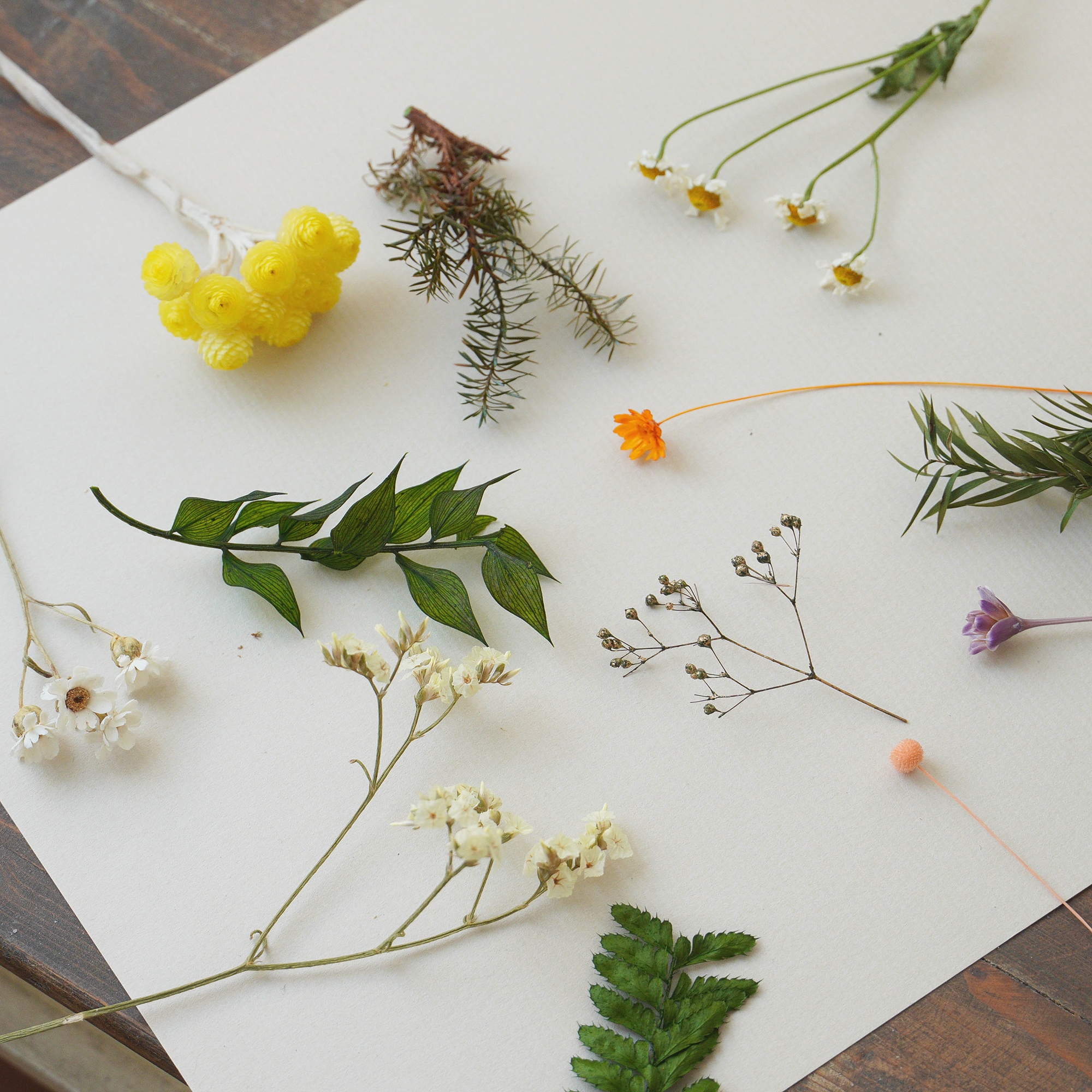 課堂上準備乾燥、不凋(永生)花材與葉材供學員自由挑選。(依現場準備為主)