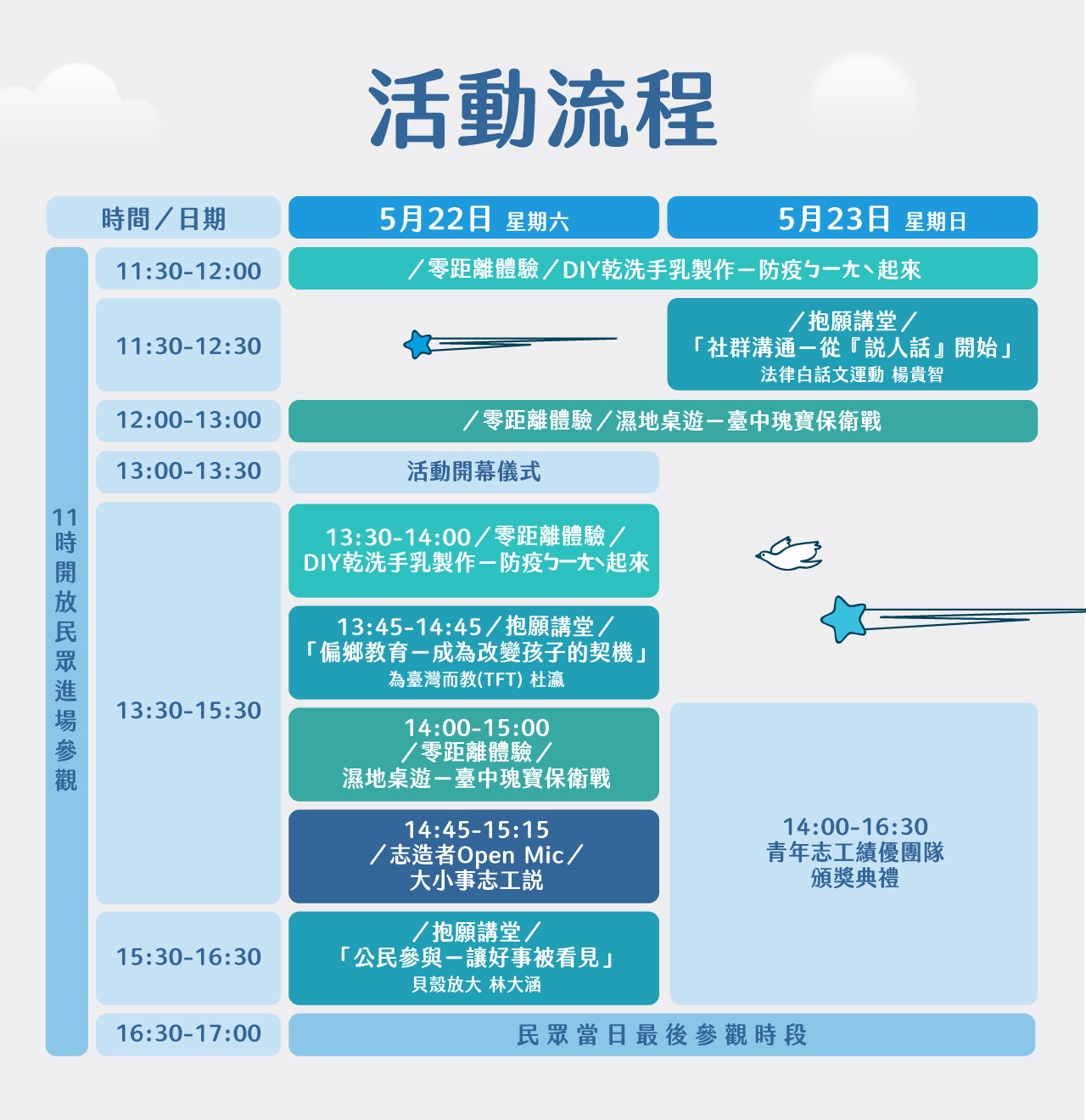 ✦導覽內容:認識台灣九大議題現況:環境永續、長者關懷、並肩同行、學童陪伴、科學教育、偏鄉社區、部落共學、醫療服務、文化傳承。