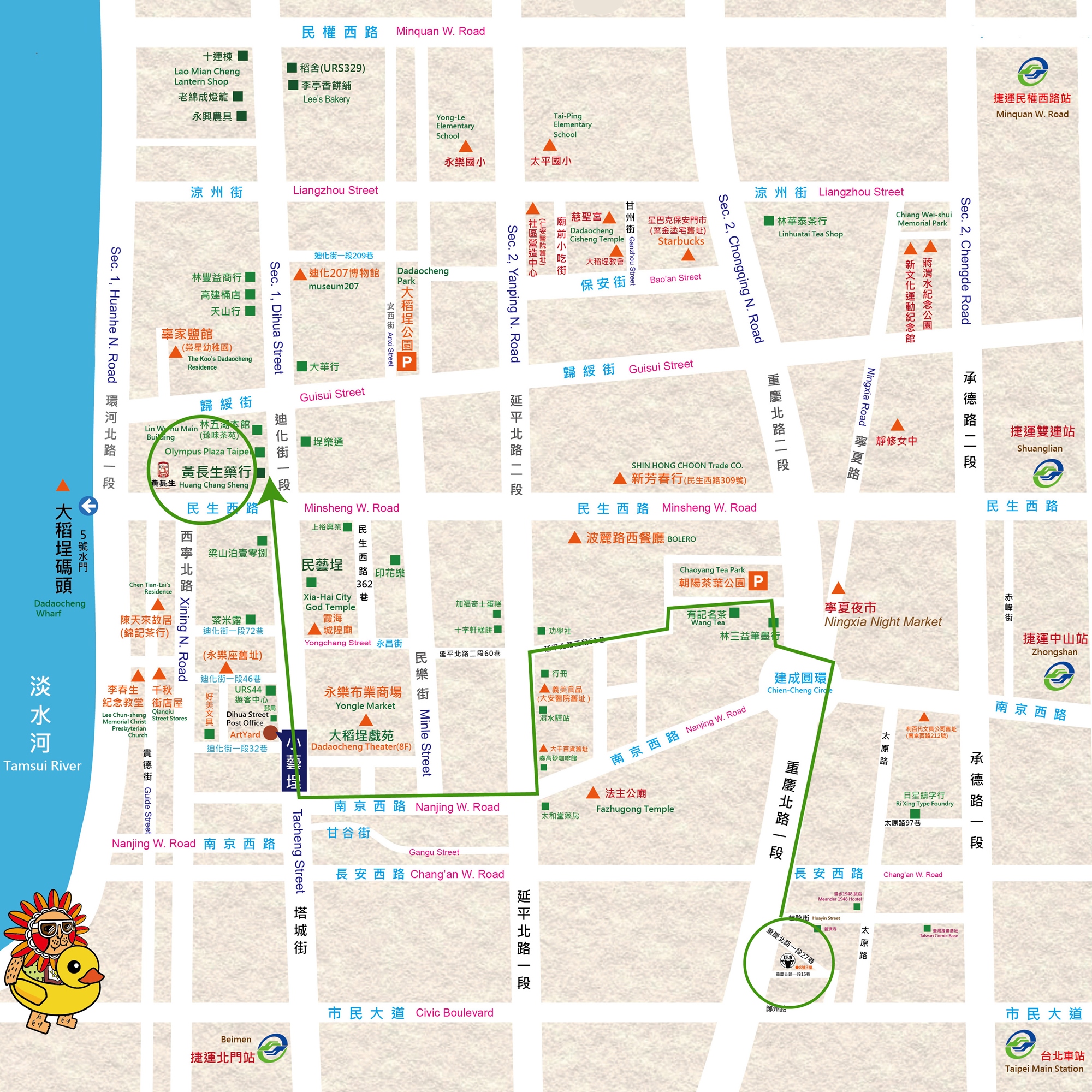 ●集合點:進行鋼珠筆DIY,筆芯顏色隨機,無法挑選,室內場地 U&S 叔叔與妹妹:台北市大同區重慶北路一段27巷8號3樓(要走樓梯至3樓右側) ●停留點:室內場地,介紹茶葉的故事 有記名茶 WANGTEA:台北市大同區重慶北路二段64巷26號 ●停留點:蔣渭水先生相關展覽,隔壁義美食品第一家門市大安醫院舊址 渭水驛站:台北市大同區延平北路二段27號 ●停留點:台北早期文物展,早期間屋樣貌 埕樂通:台北市大同區迪化街一段127號 ●停留點:數位相機旗艦店在百年老屋 Olympus Plaza Taipei 大稻埕旗艦店:台北市大同區迪化街一段142號 ●最後一站:藥行先講解酸梅湯材料包各藥材內容,再進行DIY 黃長生藥行:台北市大同區迪化街一段134號