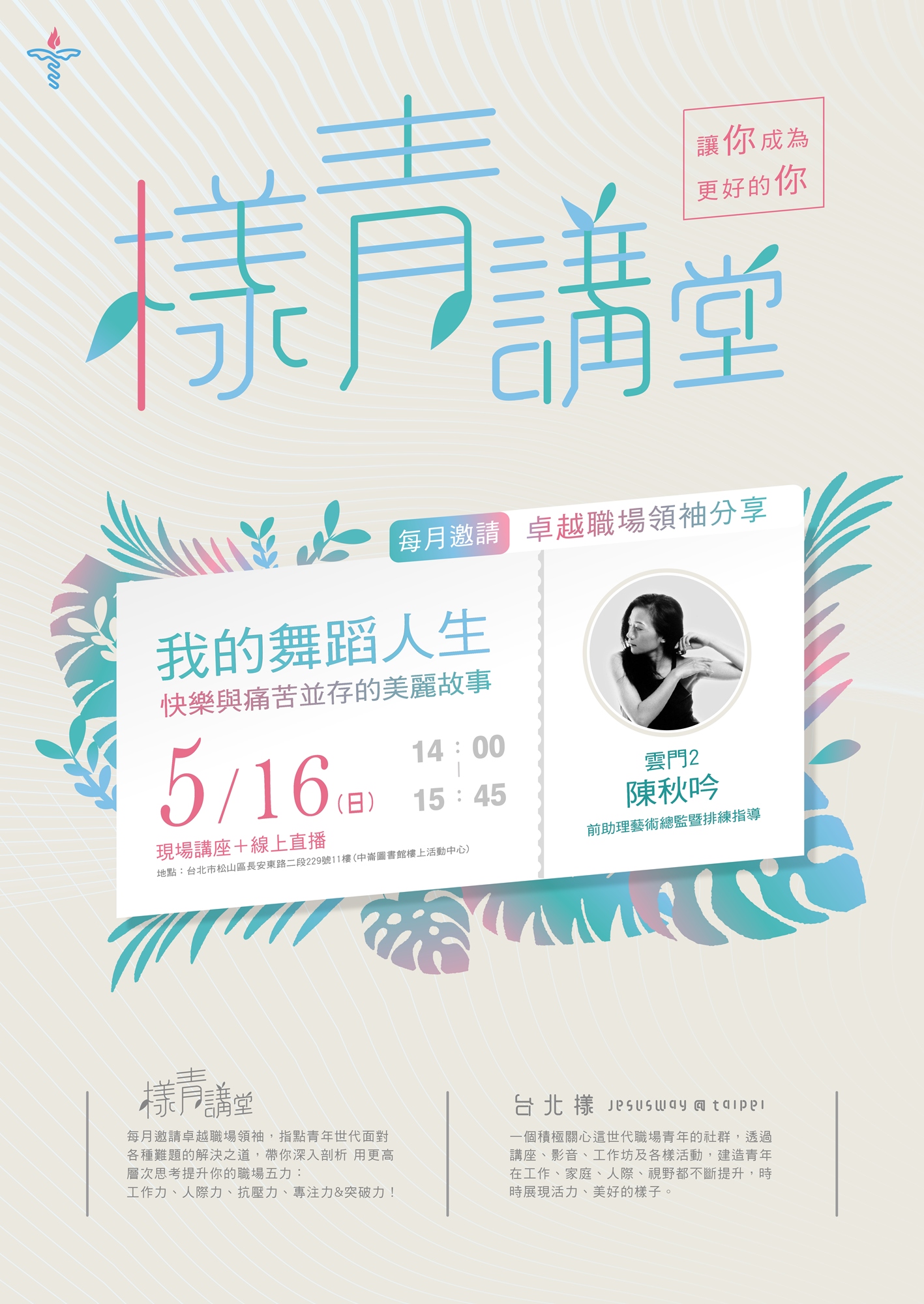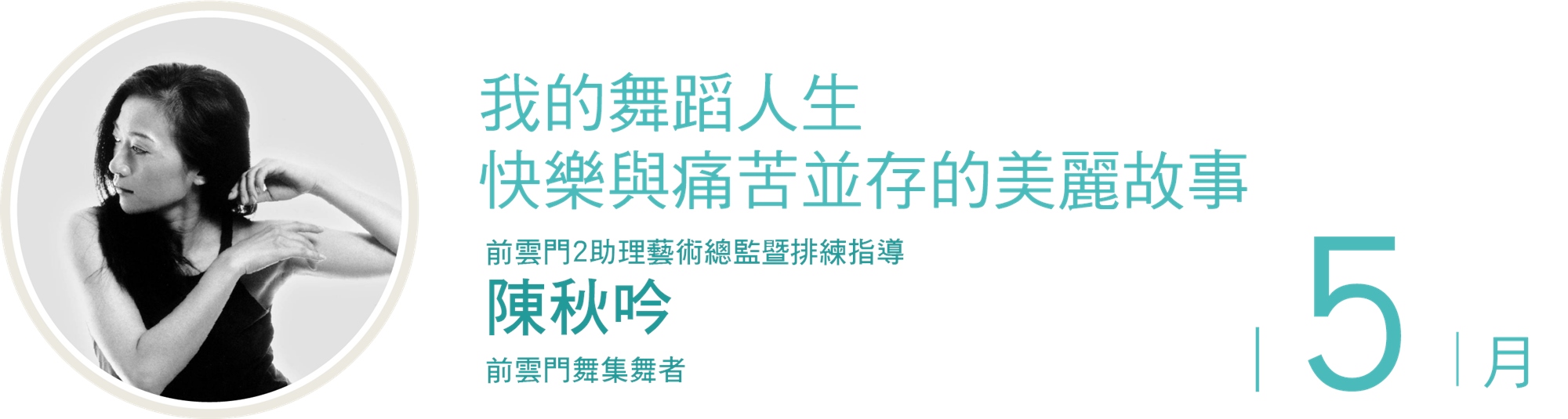 在這一堂座談會中,陳秋吟將與我們分享,從一個懷著舞蹈夢想的女孩,走上國際舞台後 如何面對自己舞者生命的轉折、職涯與家庭的掙扎。