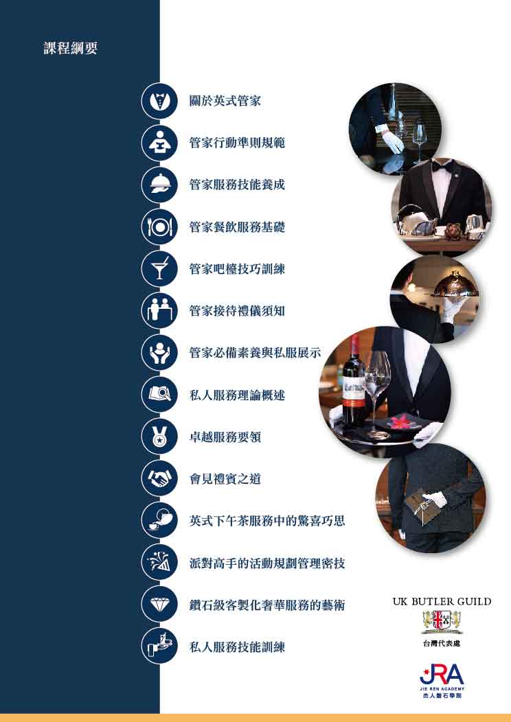 英式管家概述/管家行為規範/管家服務技巧訓練(餐飲,水吧,會見,接待)/活動規劃管理/私人服務技能訓練