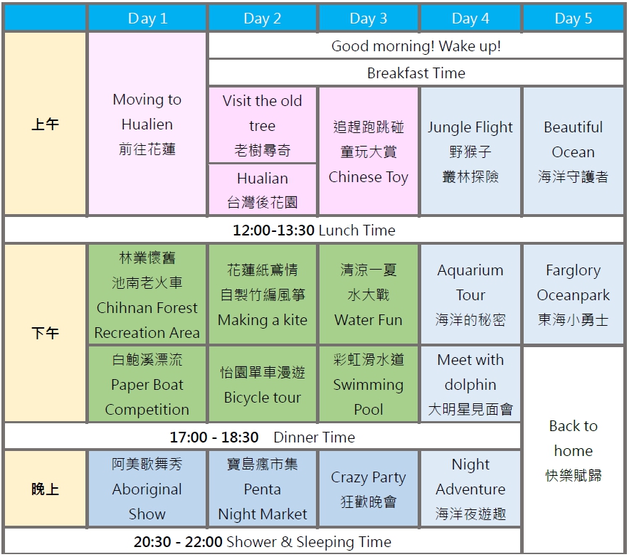 結合花蓮在地文化和活動,由外師全程一同參與林業懷舊、白鮑溪漂流、老樹尋奇、自製竹編風箏、單車漫遊、叢林探險、遠雄海洋公園、與魚兒共眠..等。