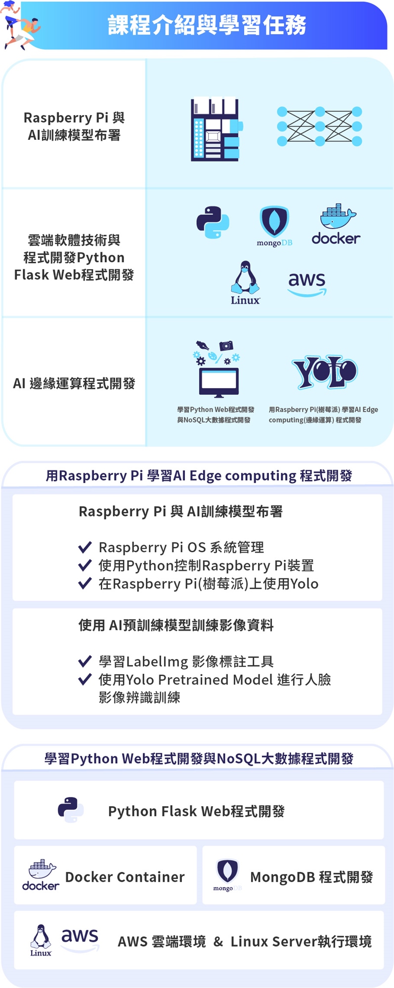 本課程是完整的 AI 全端程式(full-stack)程式開發訓練課程,從 Raspberry Pi (樹莓派)嵌入式系統程式開發、Yolo AI 影像訓練、Python Web 程式開發、MongoDB 大數據資料庫程式開發等資料工程師(Data Engineer)常用的重要技術。