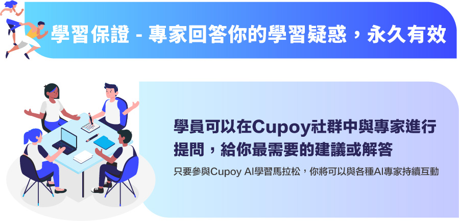 本活動的學員能永久使用 Cupoy 的 VIP 共學社群服務,隨時與專家群切磋討論 AI 問題,自由交流與觀摩其他學員作品與模型。