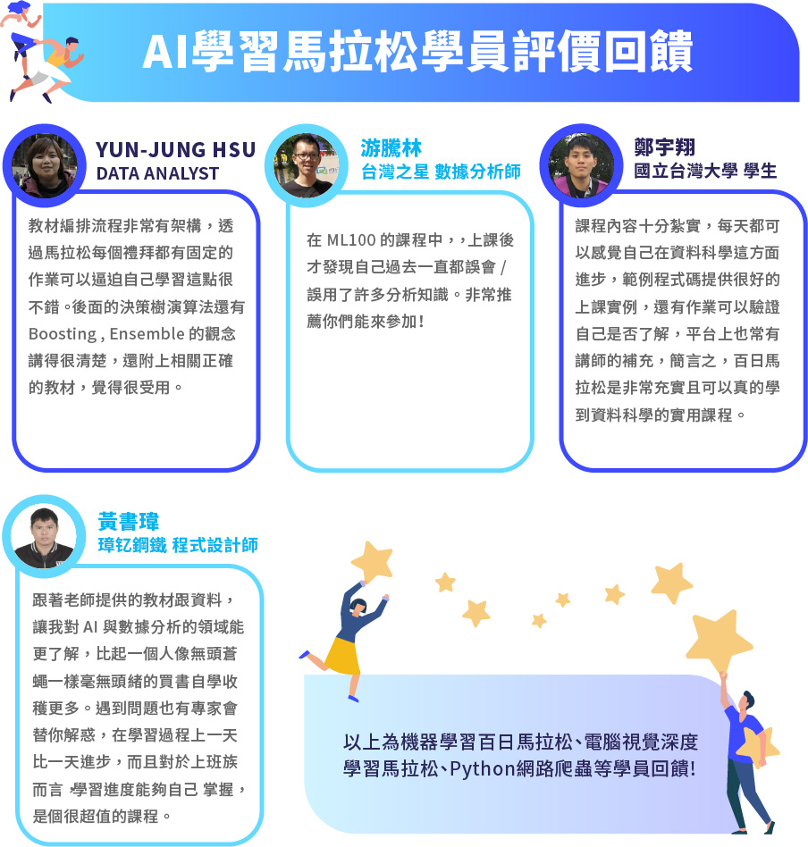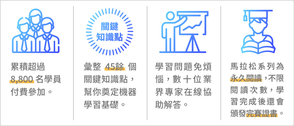 AI 學習馬拉松系列購買完成後,即可永久閱讀,不限閱讀次數,學習完成後還會頒發完賽證書。已累積共超過 8,800 多位學員參與。我們邀集了台灣優秀的 Maker 專家與智慧物聯網的開發人員以實務導向規劃最佳學習地圖,幫助 AIOT 學習者以最有效率的方法學習。加入專家們的學習社群,你能更快掌握 AI 產業應用的關鍵知識,在期末親自動手開發實務專題,留下你的實戰紀錄,讓其它人看見你的能力與努力。