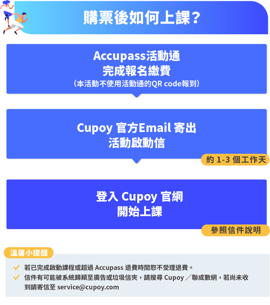 報名多人票券,僅有課程訂購人Email會收到由「Accupass」系統自動寄送訂單完成信,您與朋友將於課程上線時,收到由主辦單位分別寄送的課程活動通知信。