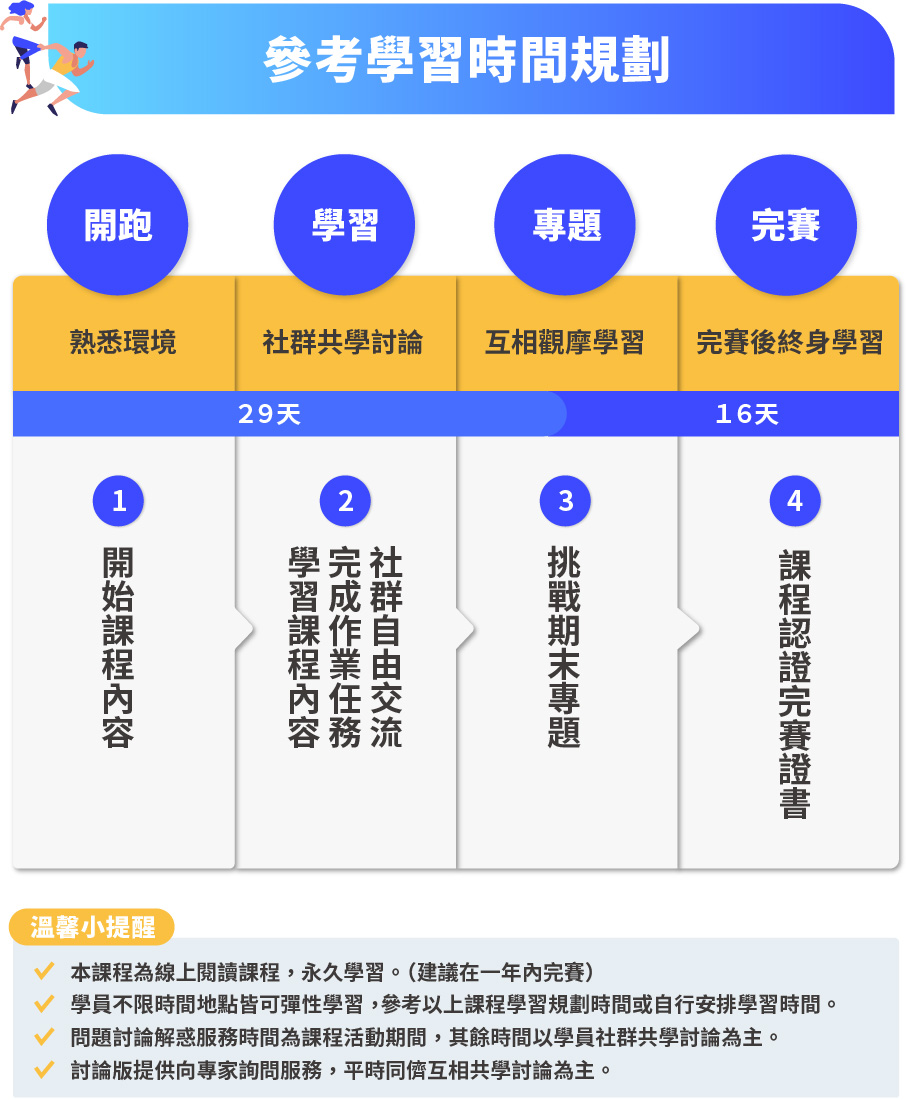 參加者可依照自己的學習狀況提交進度,毋須擔心時間過於緊湊,只要在活動結束後一年內完成,都能獲取完賽證明。