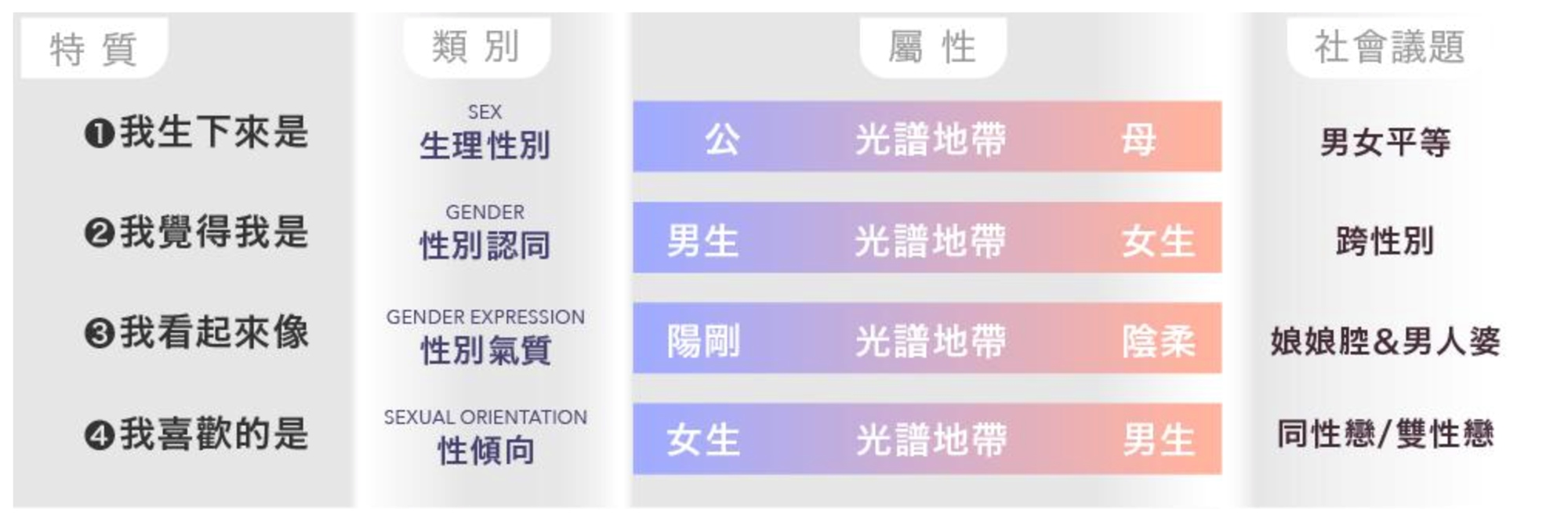 跨性別:不論是內在的性別認同(認同自己性別為何),或者外在的性別表現(以什麼樣的性別角色或性別裝扮在社會生活),只要跟男女二分的主流社會期望不同,均可被涵蓋在跨性別底下。
