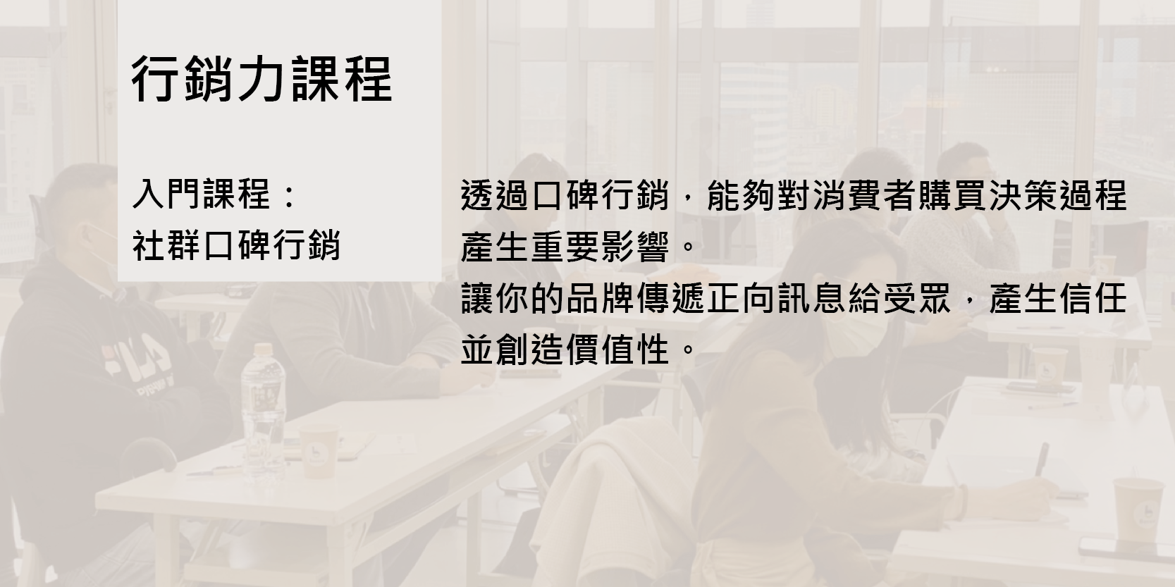 本次課程將帶領你進入口碑行銷的世界,了解如何規劃與執行,達到真正有效的口碑擴散。