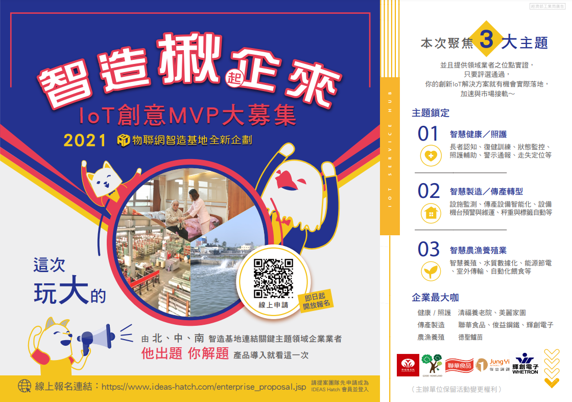 提供想開發IOT產品需求的夥伴,搭配有系統化的輔導資源,定期的媒合、評選、配對、包含IC晶片使用、機電整合、外觀設計、模具打造、小量試產以及通路媒合等內容,不管現在你的產品是構想還是已經有雛型了或是準備量產了,只要你想產品變得更好,更有價值嗎?