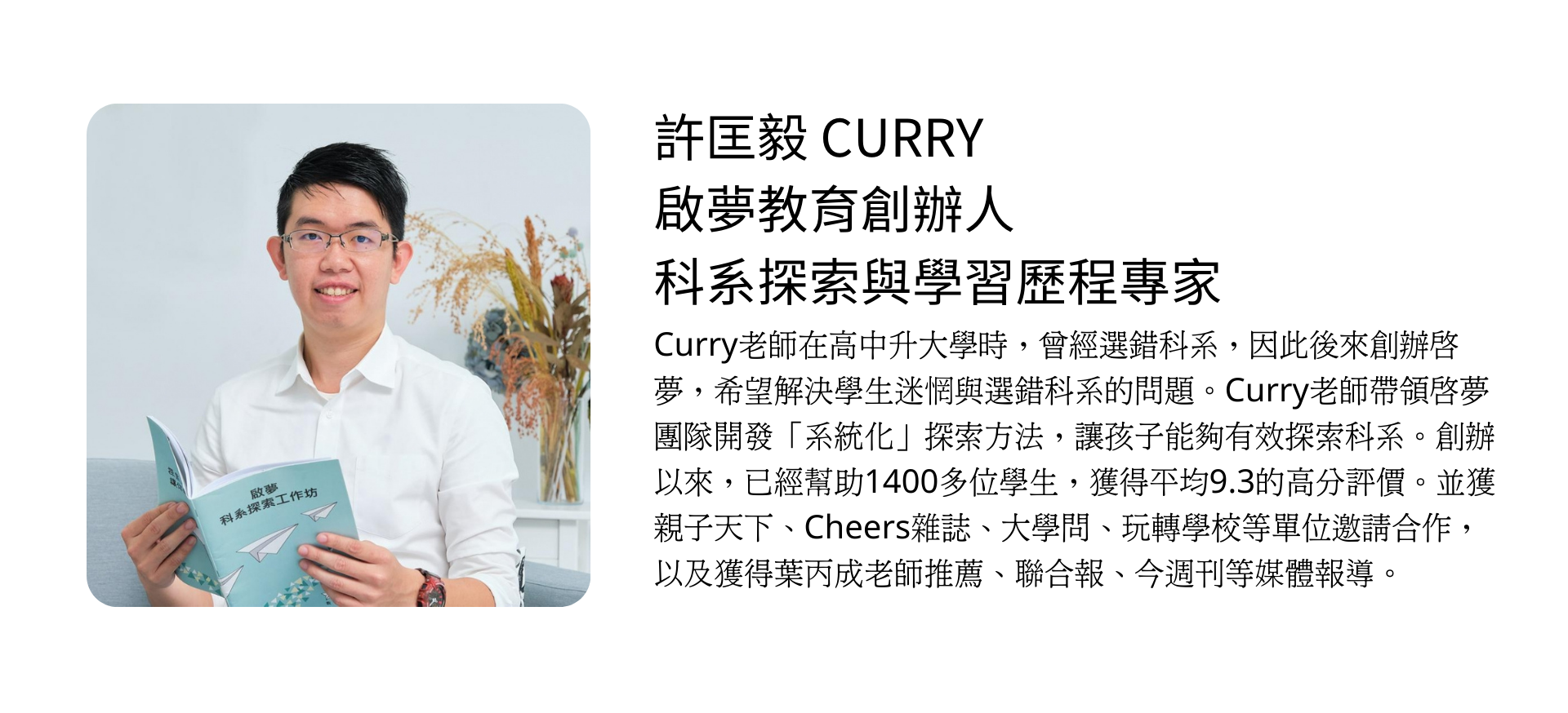特邀!親子天下及葉丙成老師推薦的科系探索與學習歷程專家.啟夢創辦人-許匡毅講師 ,分享獨創的「全面探索科系方法」引導學員了解學習檔案的內容架構。