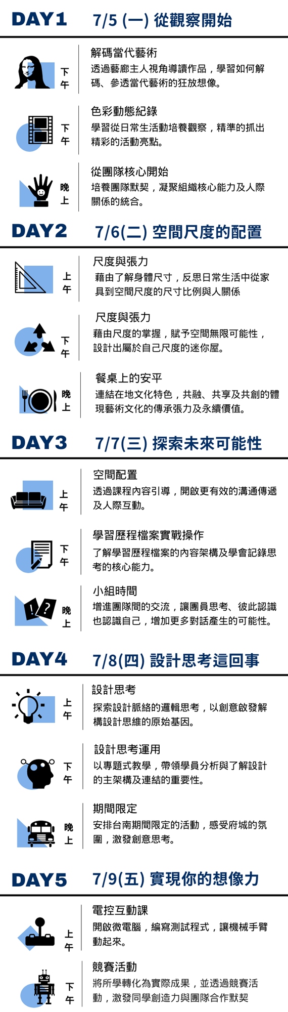 2021/7/5(一)~7/9(五) 五天四夜課程融入【當代術的解碼】、【空間尺度與張力】、【動態視資剪輯】、【設計思考】、【智能裝置互動】、【在地文化激盪】、【藝術展覽饗宴】帶領學生實戰操作,也為108課綱所需準備的學習歷程檔案做一精彩記錄。