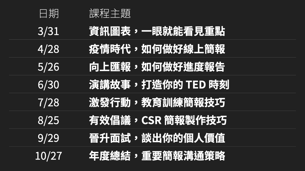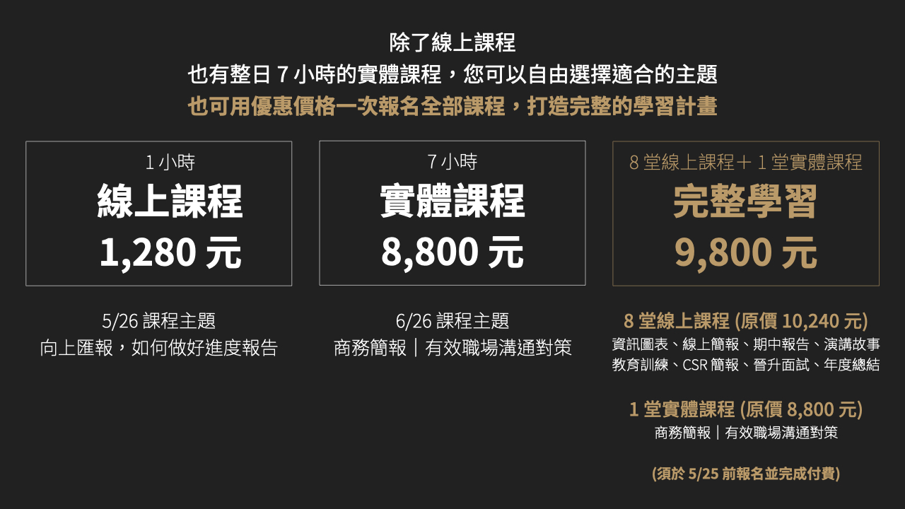 即日起至 5 / 25,您可以用優惠價格一次擁有全部課程,包含全年度 8 堂線上課程,再加贈一堂 7 小時的實體課程,為您打造完整的學習計畫 ! 線上課程可無限回放,在任何時間都能完整學習。