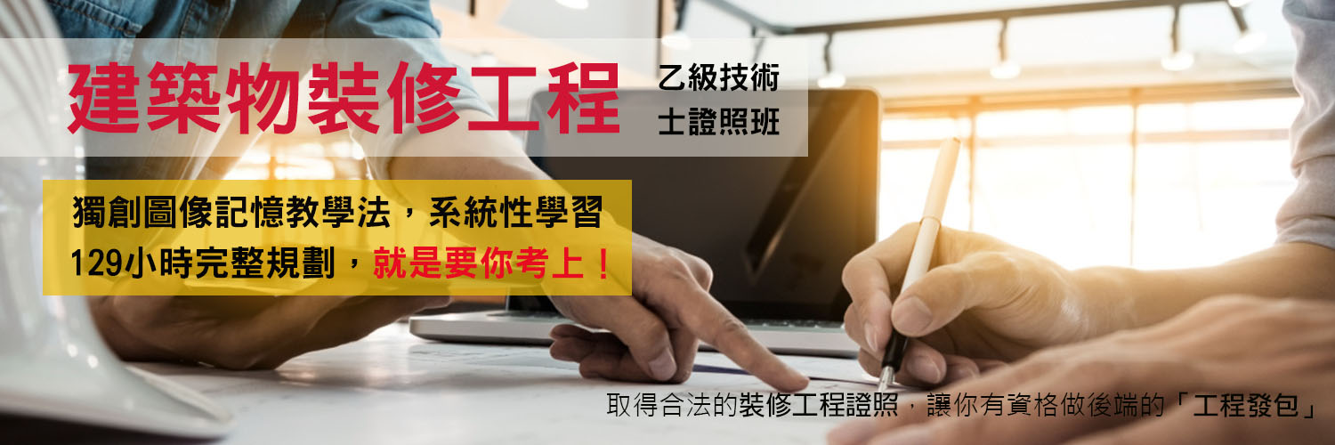 本課程採用業界碩士講師相關工程設計實務二十五年經驗以上,和乙級雙證照近十年教學資歷經驗豐富,親自整理教材和圖像記憶教學法。 從法規開始到工法由淺入深,系統性的講義教學及整理,真正扎扎實實循序教授「法規摘要、基本工法、裝修工法」完全囊括考試內容,讓學員能夠快速學會專業知識及考試技巧。