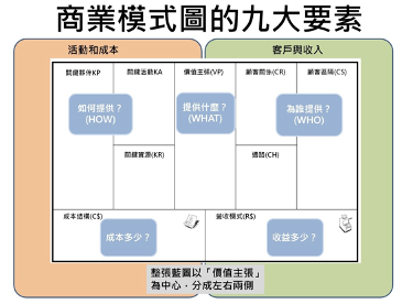 1.學習商業模式分析法上應具備的九大要素、分析的程序與步驟、使用者研究方法、顧客價值主張的決定、建立顧客關係、確定商業關鍵活動、資源與夥伴等知識與應用技巧。