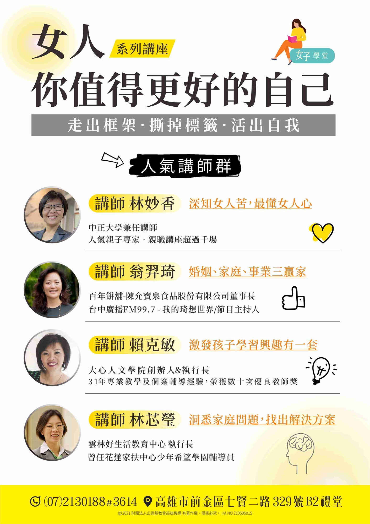 我們將這些課程安排分佈在5、6、7月,並提供學習地圖指引,讓你走在逐步提升自我,成為知性、知足、美麗又有自信的自己。