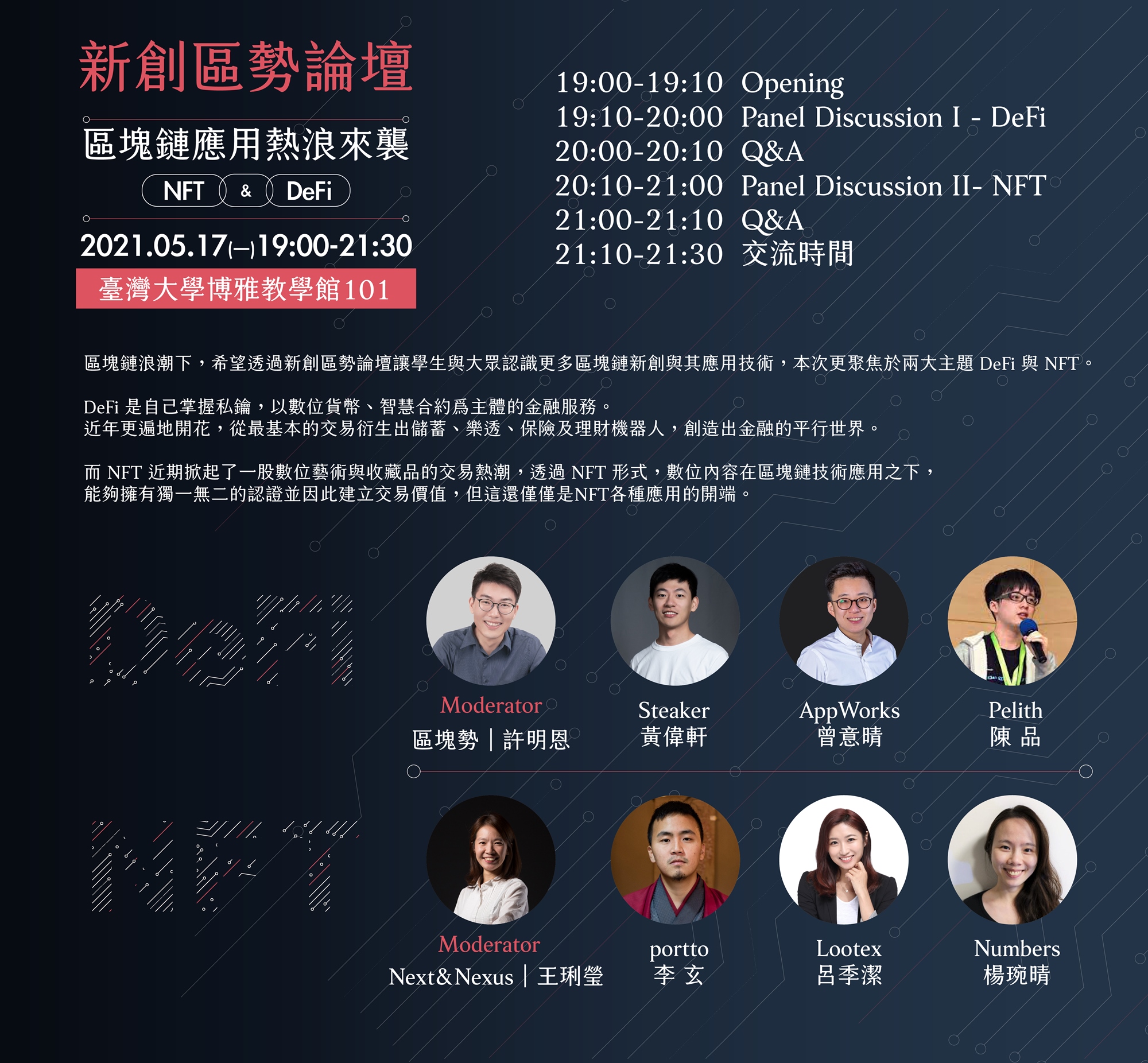因應今日 (5/11) 傳出多起本土案例,據疫情指揮中心宣布的大型活動規範,避免群聚感染,顧及民眾健康。原訂5/17(一)於博雅教學館101 舉辦「新創區勢論壇|區塊鏈應用熱浪來襲NFT&DeFi」 將 #取消當日活動 並 #將視疫情控制情況再擇期舉辦,造成您的不便,敬請見諒。