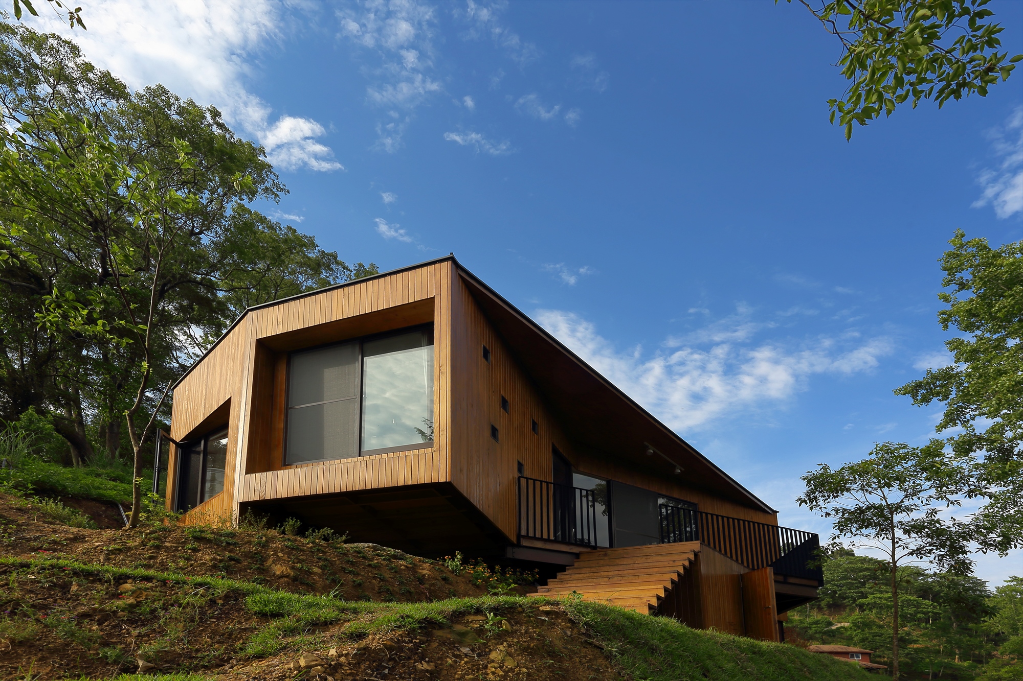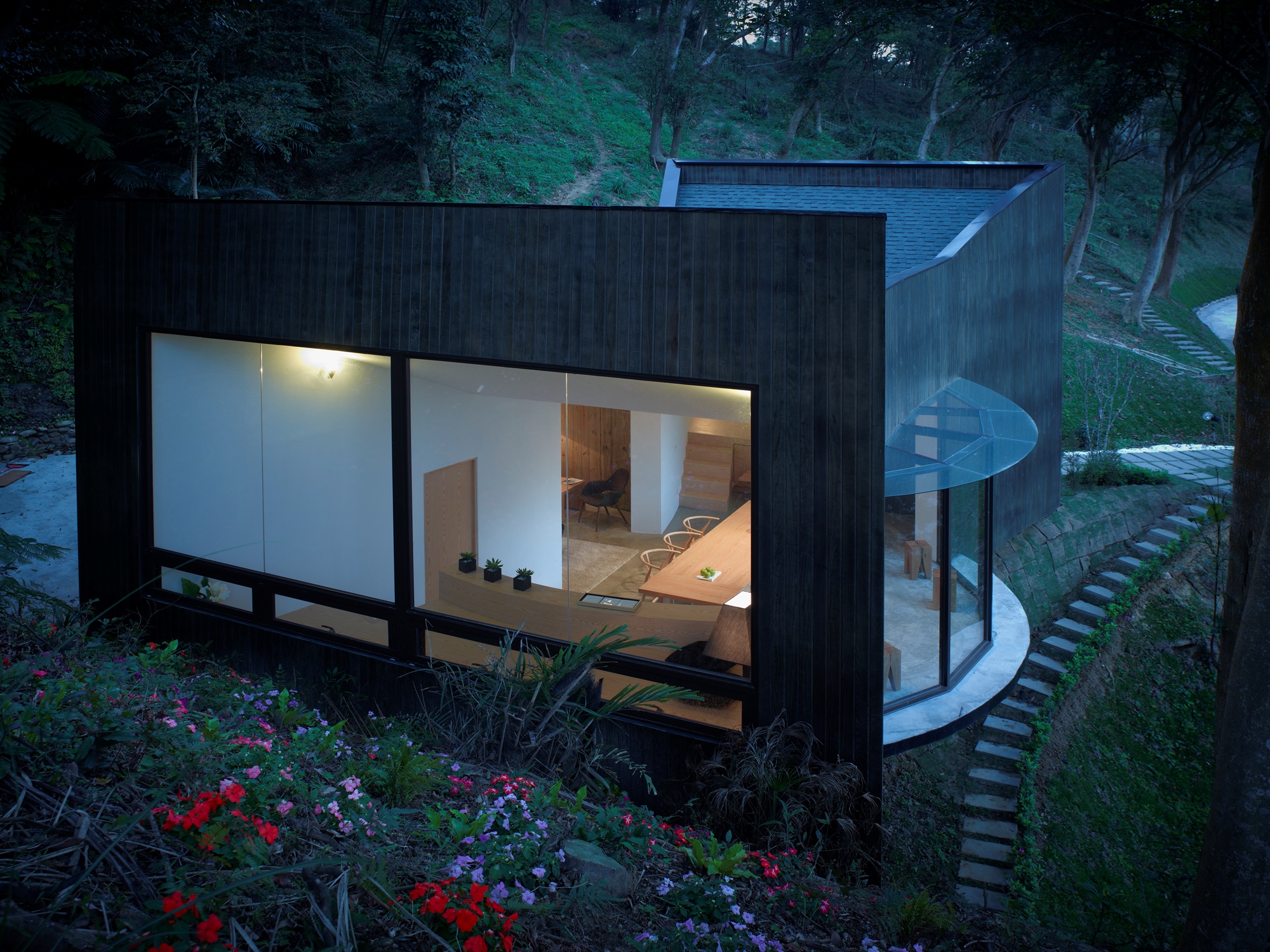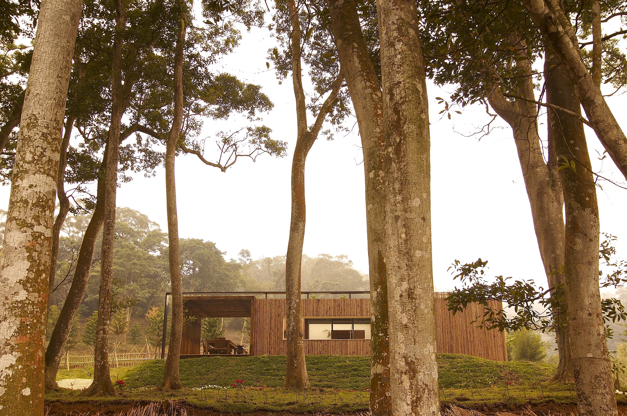 小屋設計是一則又一則的寓言故事,例如臥房可以是帳篷化身,餐廳也可以是閱讀夕陽的鳥窩。又或者讓屋裡的隔牆消失,再把房子的身體打開,這時大露臺上的陽光會牽著微風走進來,在房子身體裡畫出一張蜿蜒的大木桌。於是,你以為消失了的客廳卻帶了更多的戲份回到圖面上,化身為一座飄浮在樹梢上的咖啡館。