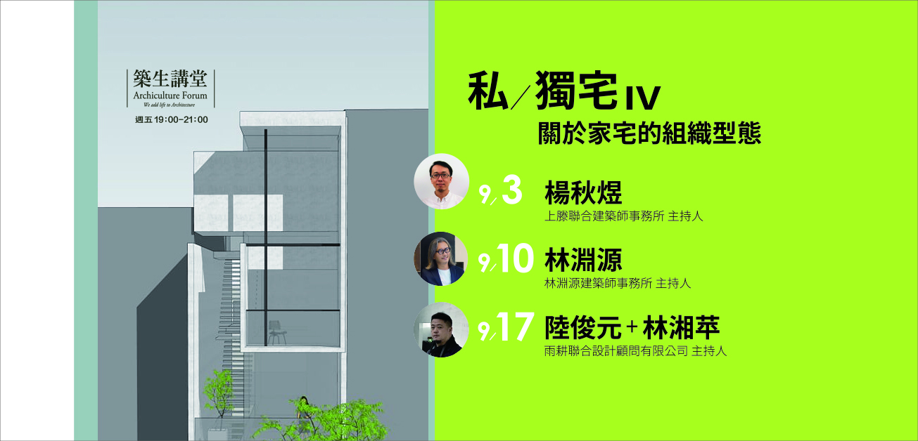 今年我們邀請到了楊秋煜、林淵源、陸俊元、林湘苹四位老師,將用三堂課,從日常、慾望、脈絡中,由不同的「私/獨宅」設計,長出不同的家。